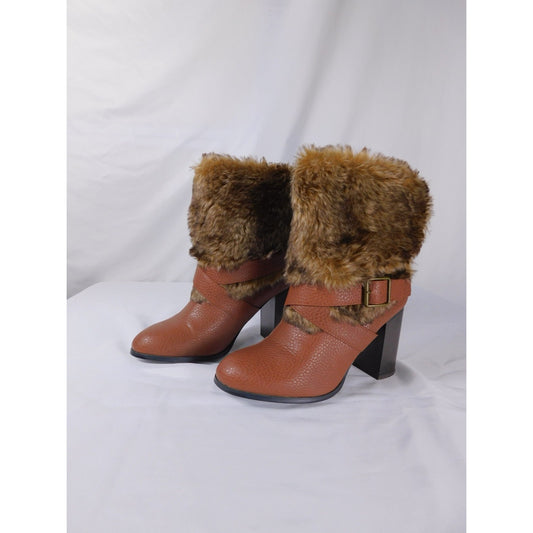 Lena Stone Brown Faux Fur Chunky Heel Booties 10 - Buckle Zip Winter - New