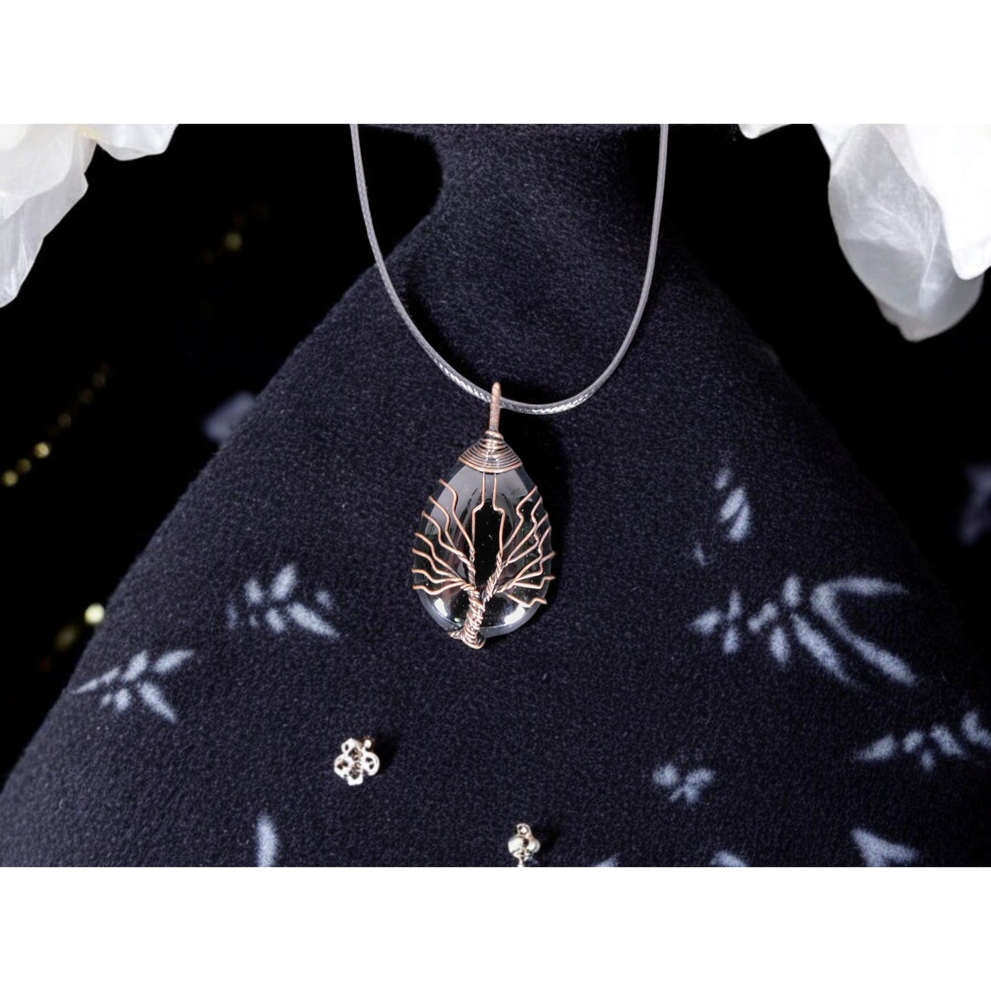 Ground yourself with this striking Black Onyx Tree of Life pendant necklace. Featuring a water-drop-shaped Black Onyx stone wrapped in intricate copper wire to form the Tree of Life, this necklace symbolizes strength, protection, and connection to the earth. Paired with an 18-inch black cord, this piece is versatile and elegant for everyday wear or spiritual practices.