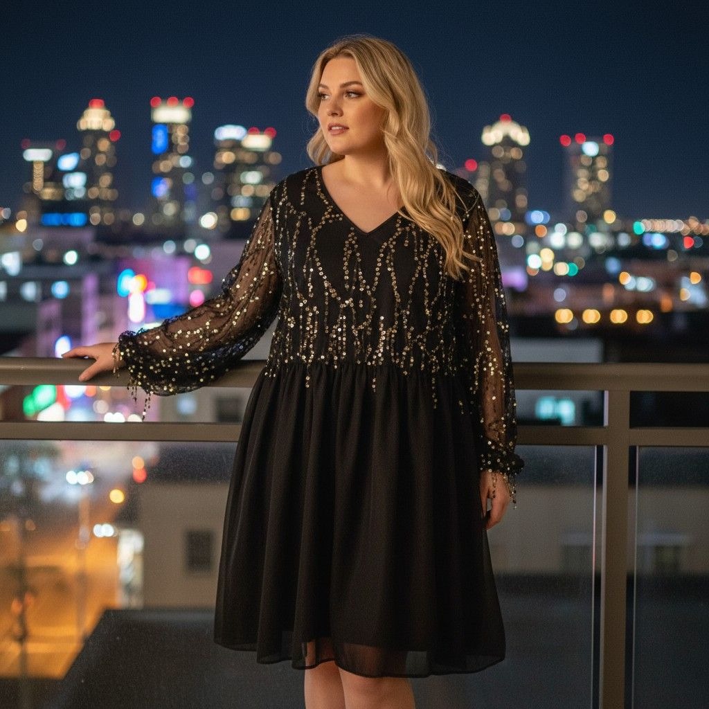 Rule the midnight ball in this pre-owned BloomChic US 26 black & gold sequin party dress — deep V-neck, long sheer mesh sleeves sparkle with cascading sequins front & back, gathered tulle-look skirt over comfy lined interior. Hand-wash, perfect for Yule celebrations, coven formals, or anytime you want to feel like a plus-size dark goddess.