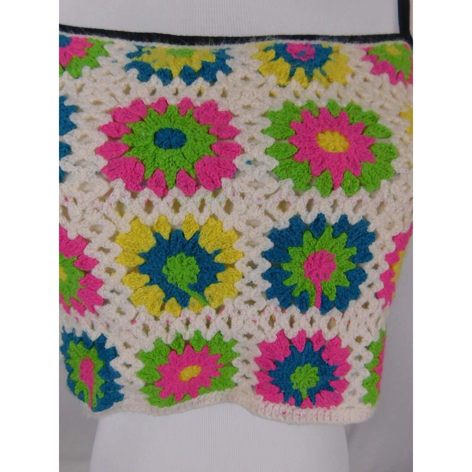 Dance through festival season in this pre-owned granny-square crochet crop top (fits women’s S) — ivory base explodes with neon pink, green, blue & yellow floral squares on the front, black binding, adjustable spaghetti straps, stretchy ivory back (56% cotton blend) + full lining. Perfect boho witch layer for sabbat circles or summer solstice raves.