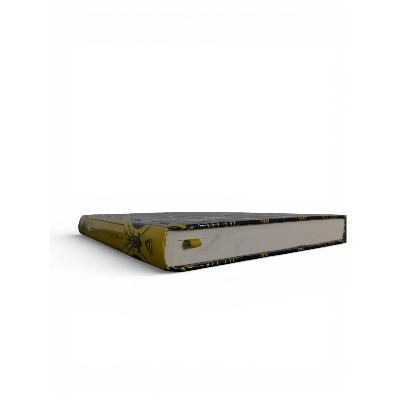 Hardcover binding with black background and ornate gold floral artwork on the front, spine, and back cover, plus matching decorative endpapers and an integrated yellow ribbon bookmark.