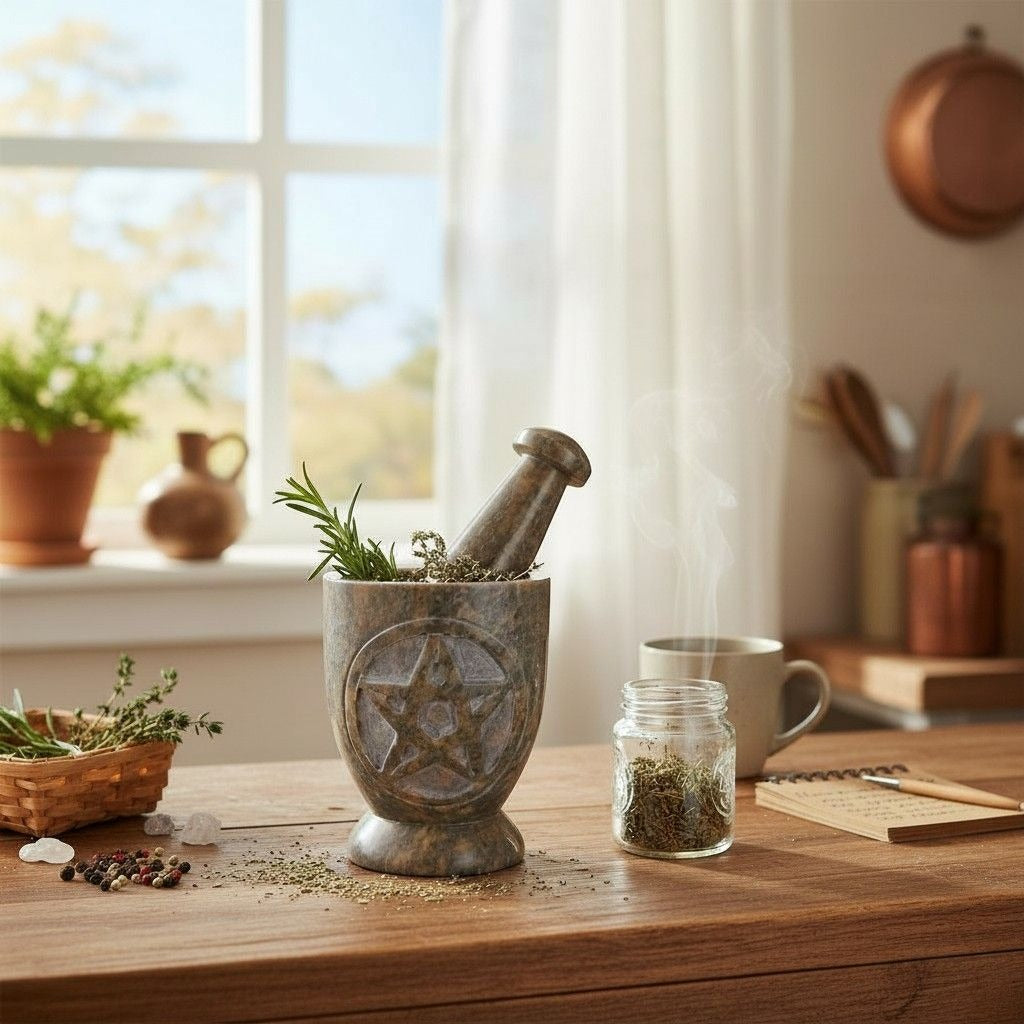 Brand-new hand-carved black soapstone mortar & pestle from India – 4" tall × 3" diameter, twin pentacles deeply etched on opposite sides, smooth interior bowl, natural stone color/texture may vary slightly. Heavy, non-porous, and perfectly balanced for grinding herbs, resins, spell powders, incense, or kitchen witch recipes. A powerful, ready-consecrated altar tool.