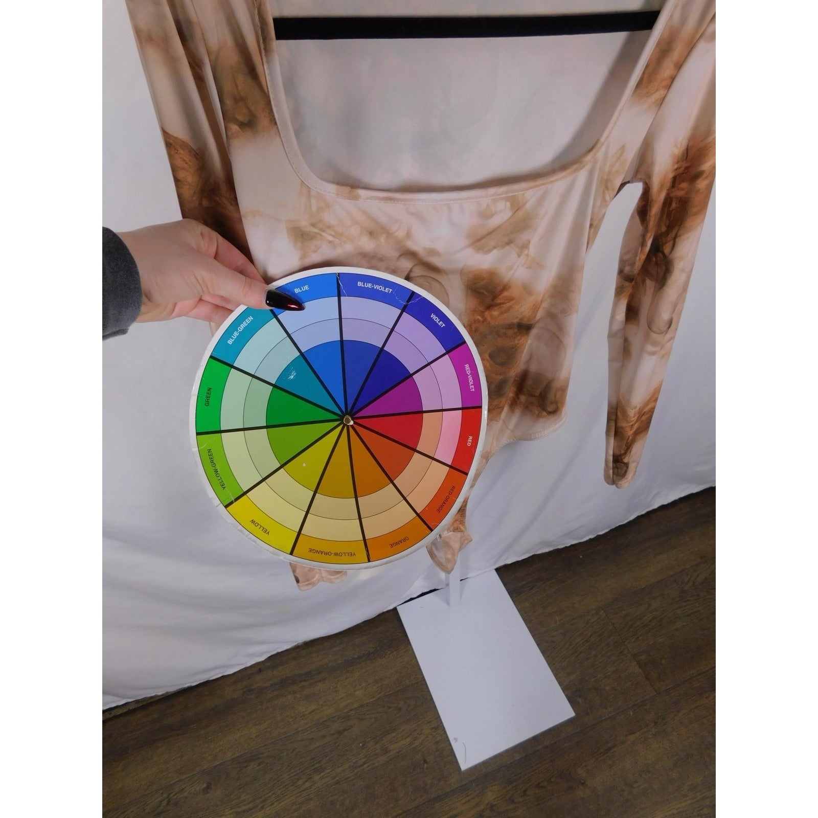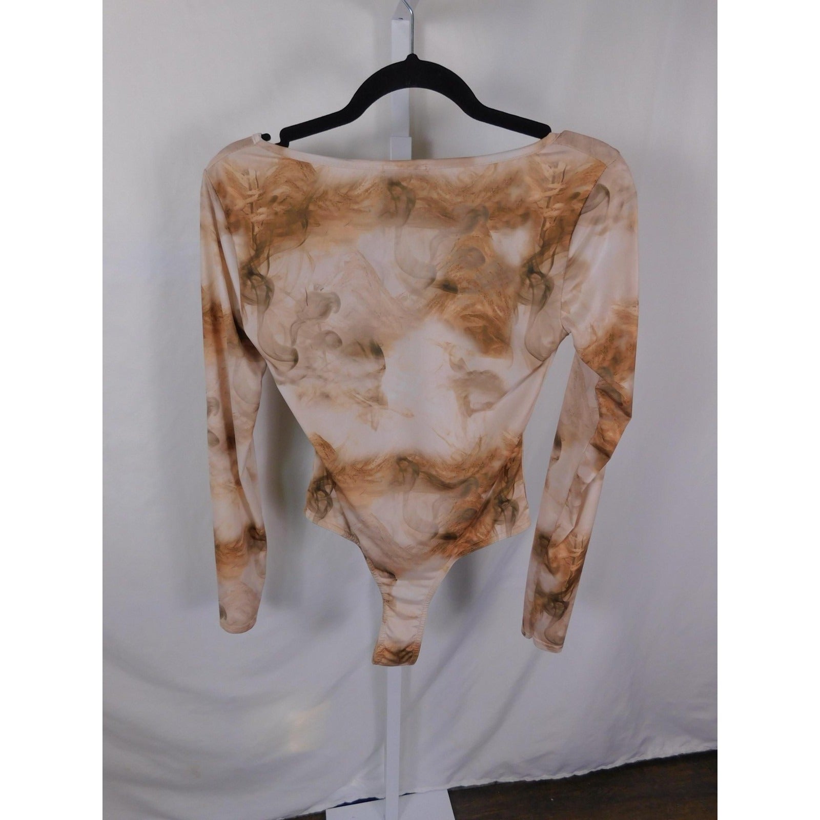 Slip into swirling smoke spells with this pre-owned PrettyLittleThing US 8 (UK 12) long-sleeve bodysuit—beige-brown marble print ripples like potion mist across 95% polyester 5% elastane stretch knit. Scoop neck, snap crotch, body-hugging fit; perfect Ethereal & Elemental layer under skirts or solo for moonlit rites. Made in UK. The Witches Quest curation.