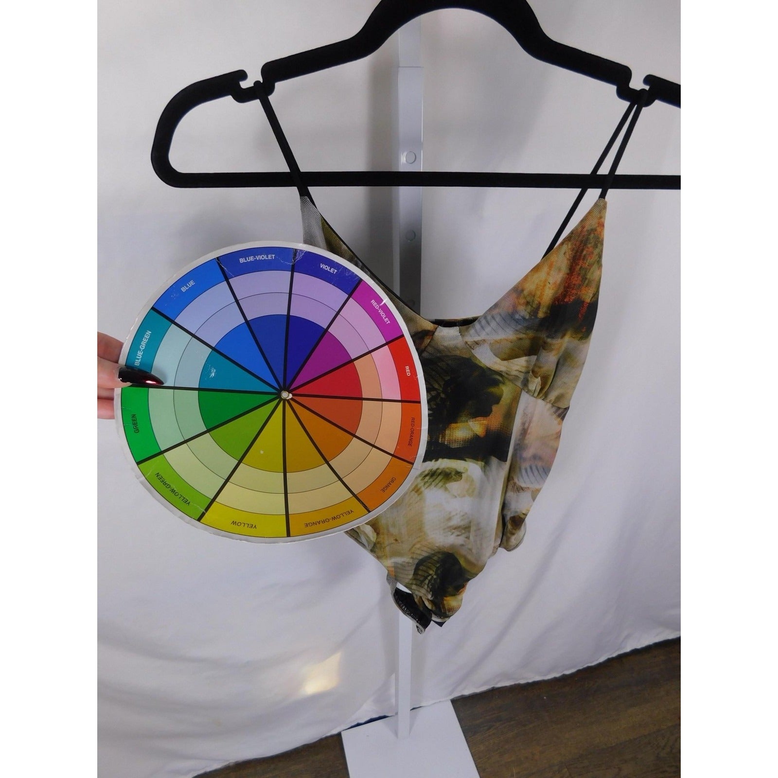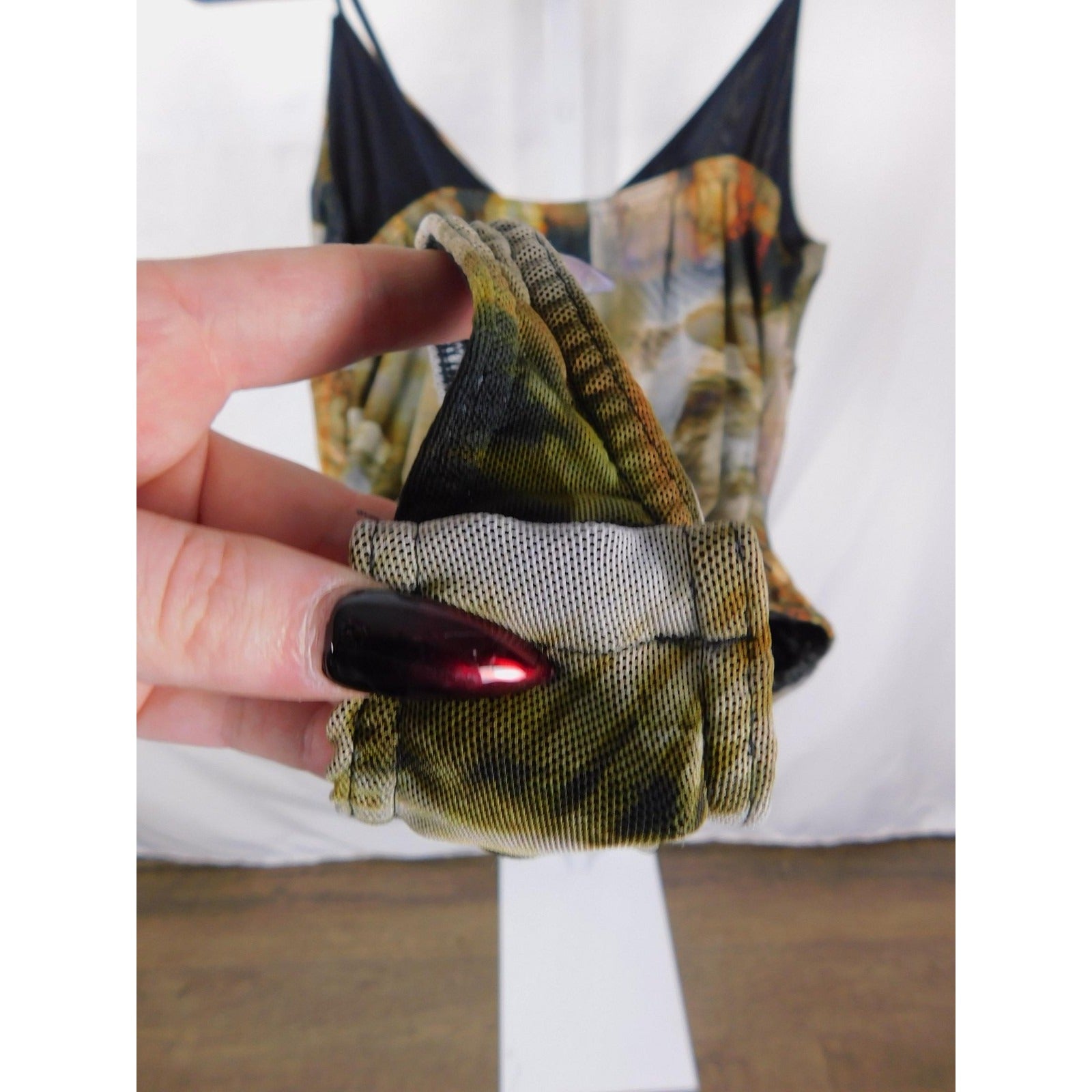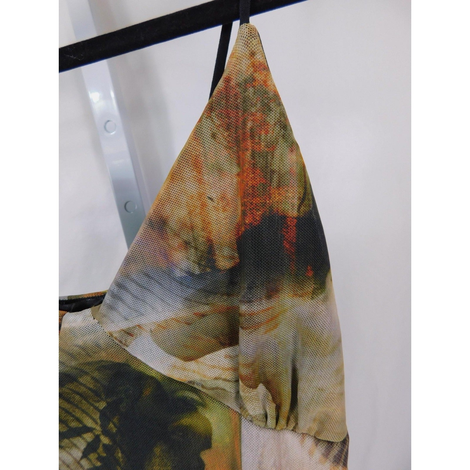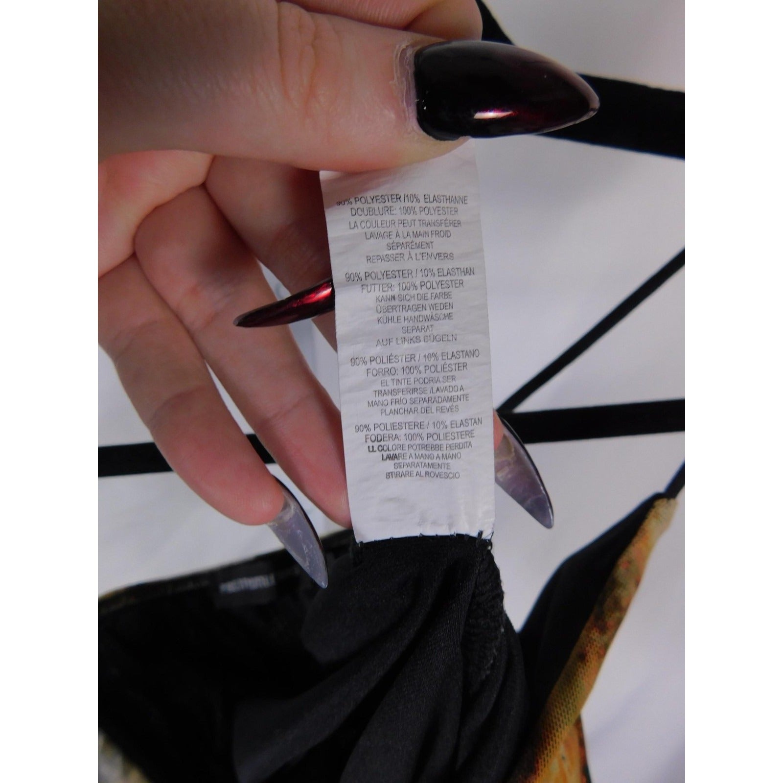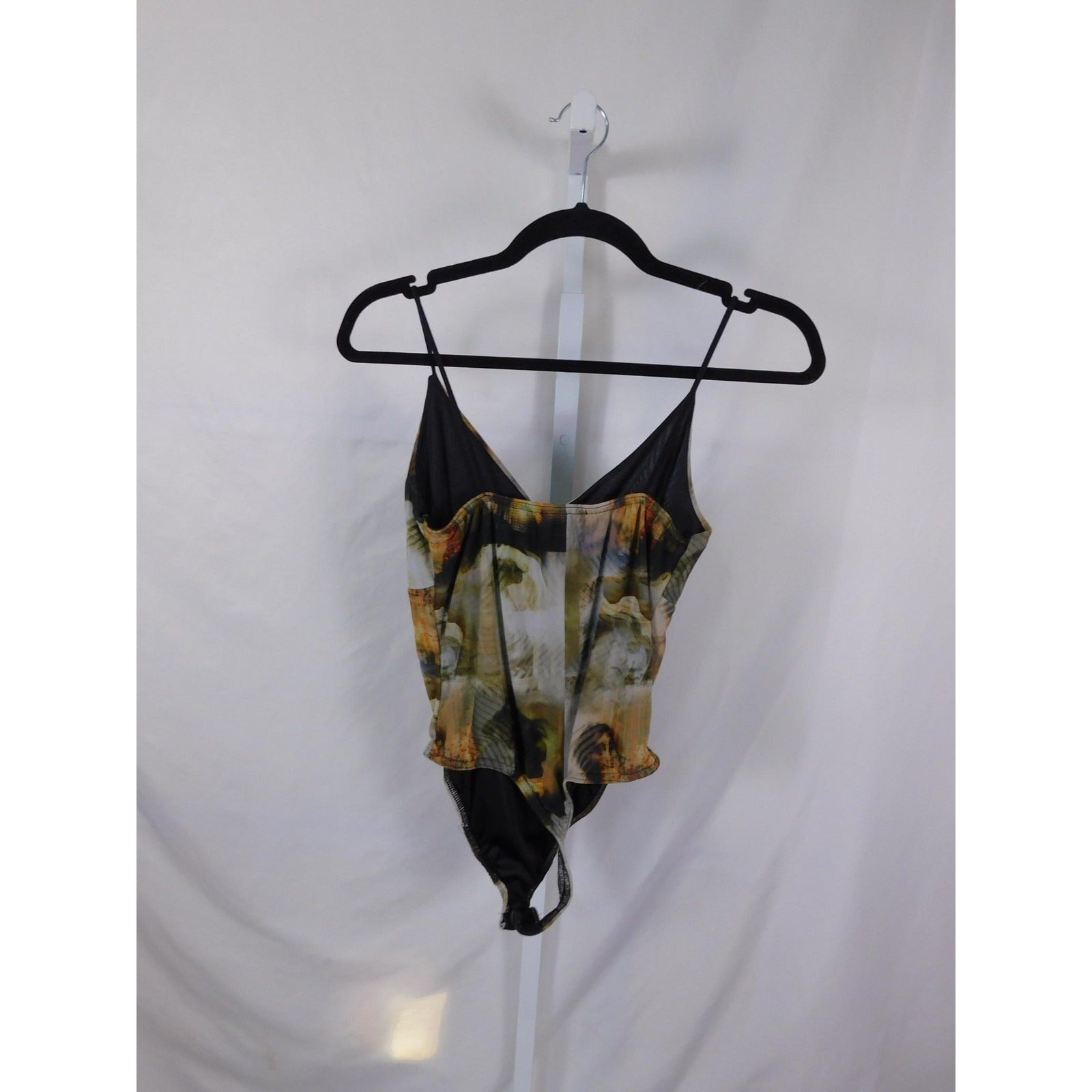 Summon baroque-witch glamour in this pre-owned PrettyLittleThing US 8 mesh bodysuit — stretchy abstract/renaissance print in olive, yellow, orange & black swirls over fully lined body, spaghetti straps, deep V-neck, scoop back, 3-snap gusset. 90% polyester/10% elastane mesh, made in Moldova. Hand wash cool. Perfect for layering under skirts, festival looks, or solo spellwork.