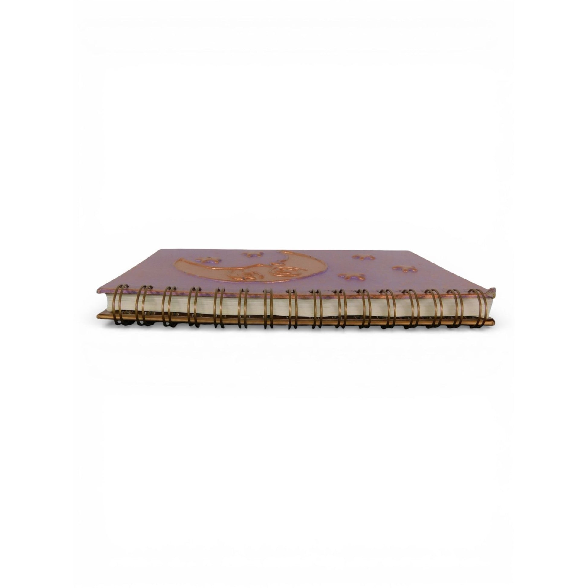 A richly textured celestial spiral journal featuring a raised metallic crescent moon and stars on a purple background. Designed for ritual notes, spellwork, shadow journaling, or everyday writing with a mystical aesthetic.
