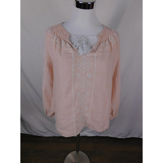 Joie Linen Peasant Blouse Womens XS Pink Embroidered Boho Tassel Tie Woven Top