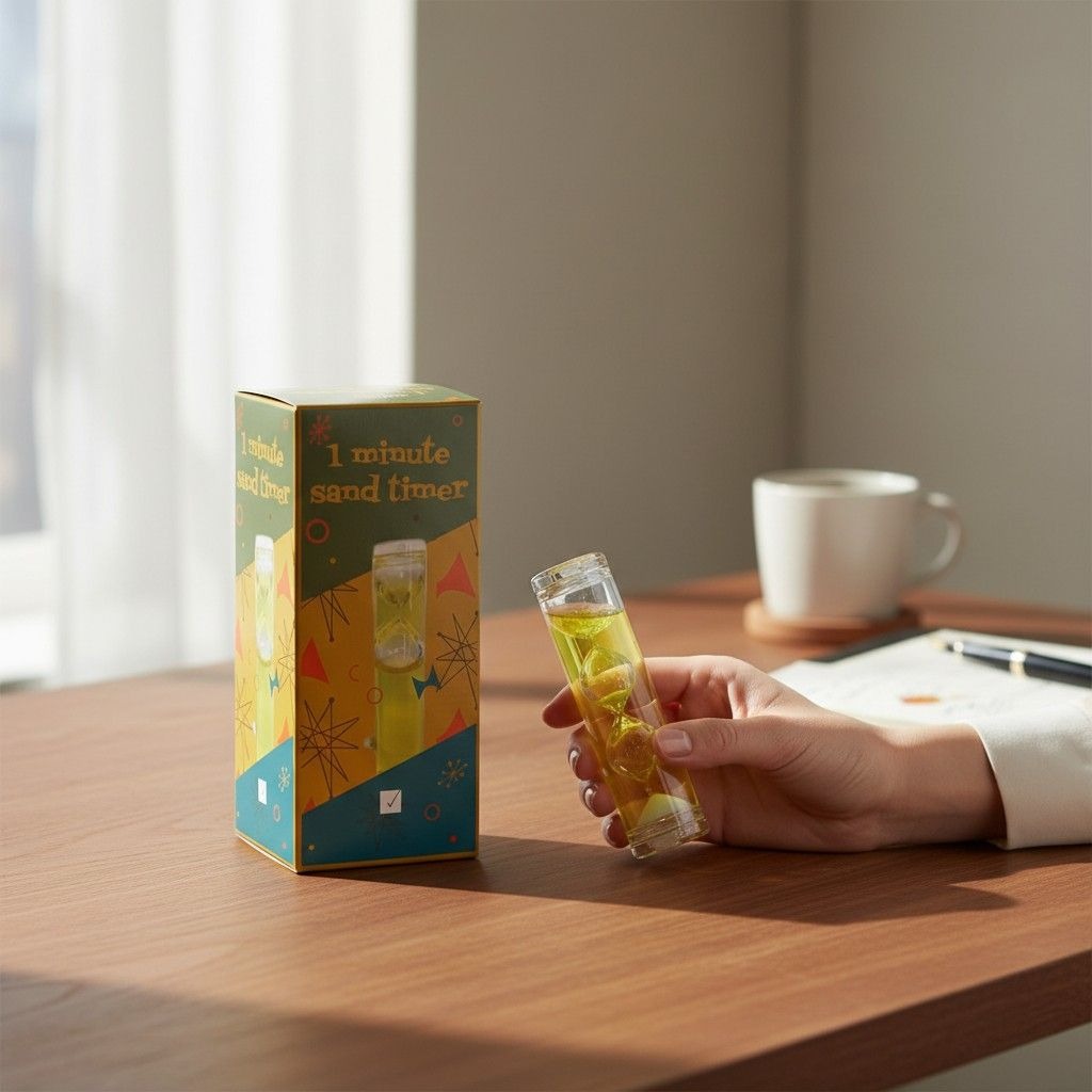 Brand-new 4.5" glass liquid sand timer with bright yellow “sand” that falls in exactly 1 minute. Perfect for: