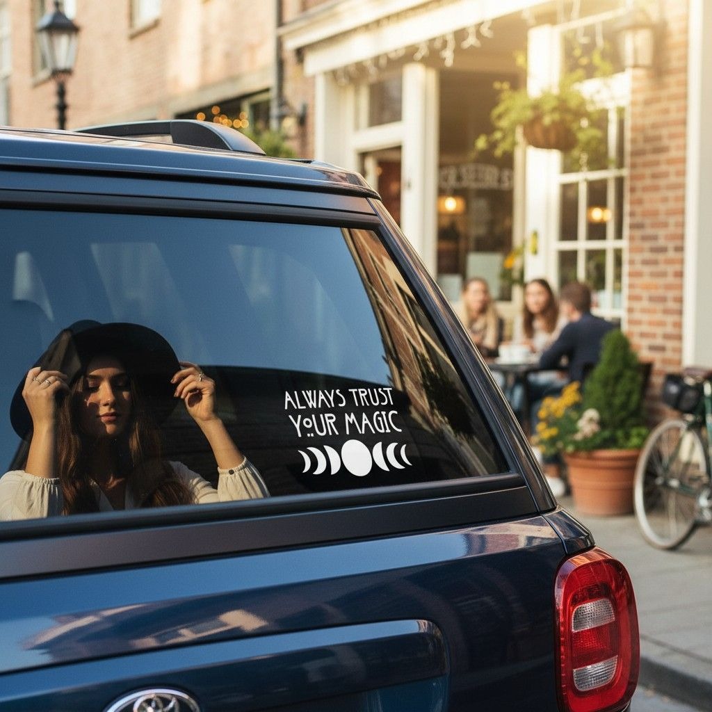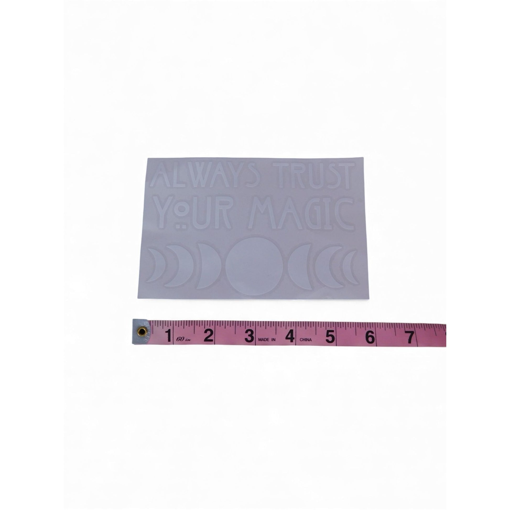 Brand-new 6" × 4" weatherproof white vinyl decal – “Always Trust Your Magic” in flowing script. Perfect for car windows, laptops, grimoires, water bottles, or altar boxes. High-quality permanent adhesive, easy bubble-free application, lasts years indoors or out. A daily reminder to own your power.