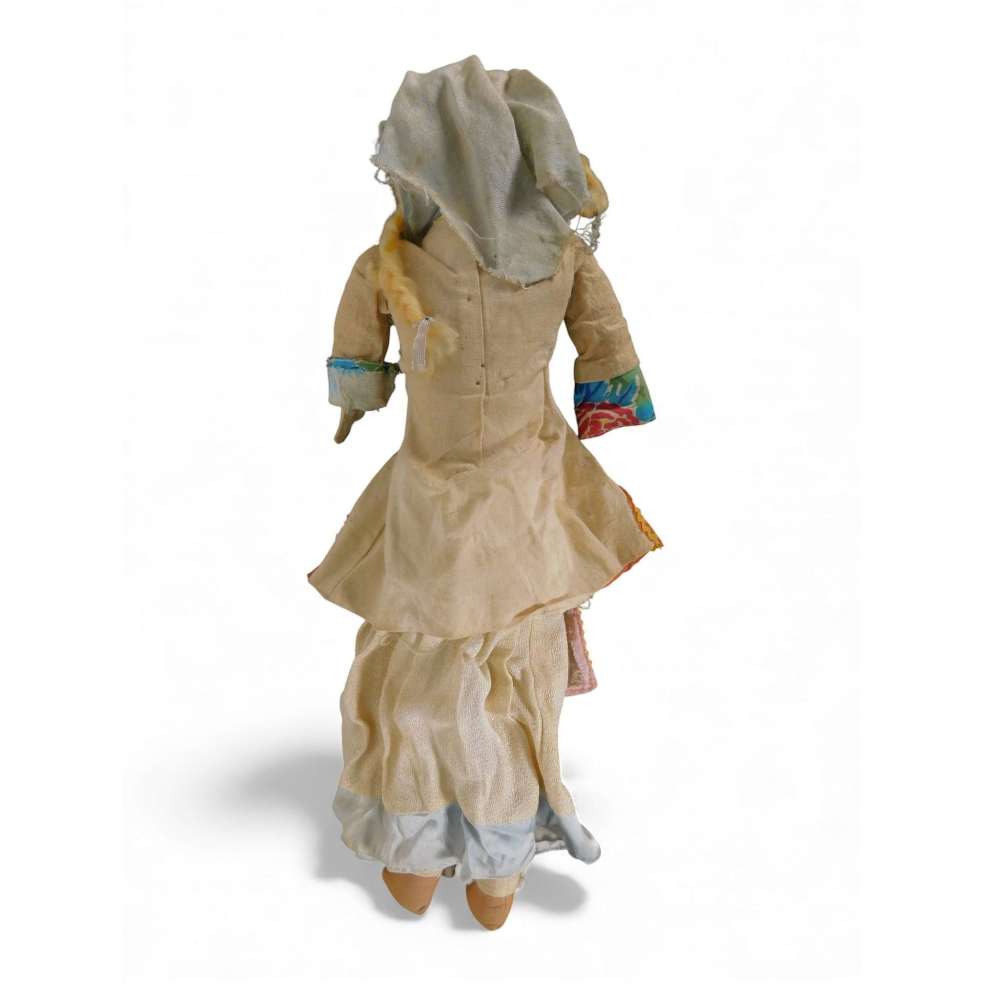 Significant age-related wear: paint loss and crazing on face, fabric discoloration, uneven arms, and overall distress. Not suitable as a toy — this is a survivor meant for collectors, ritual poppets, or artistic reimagining.