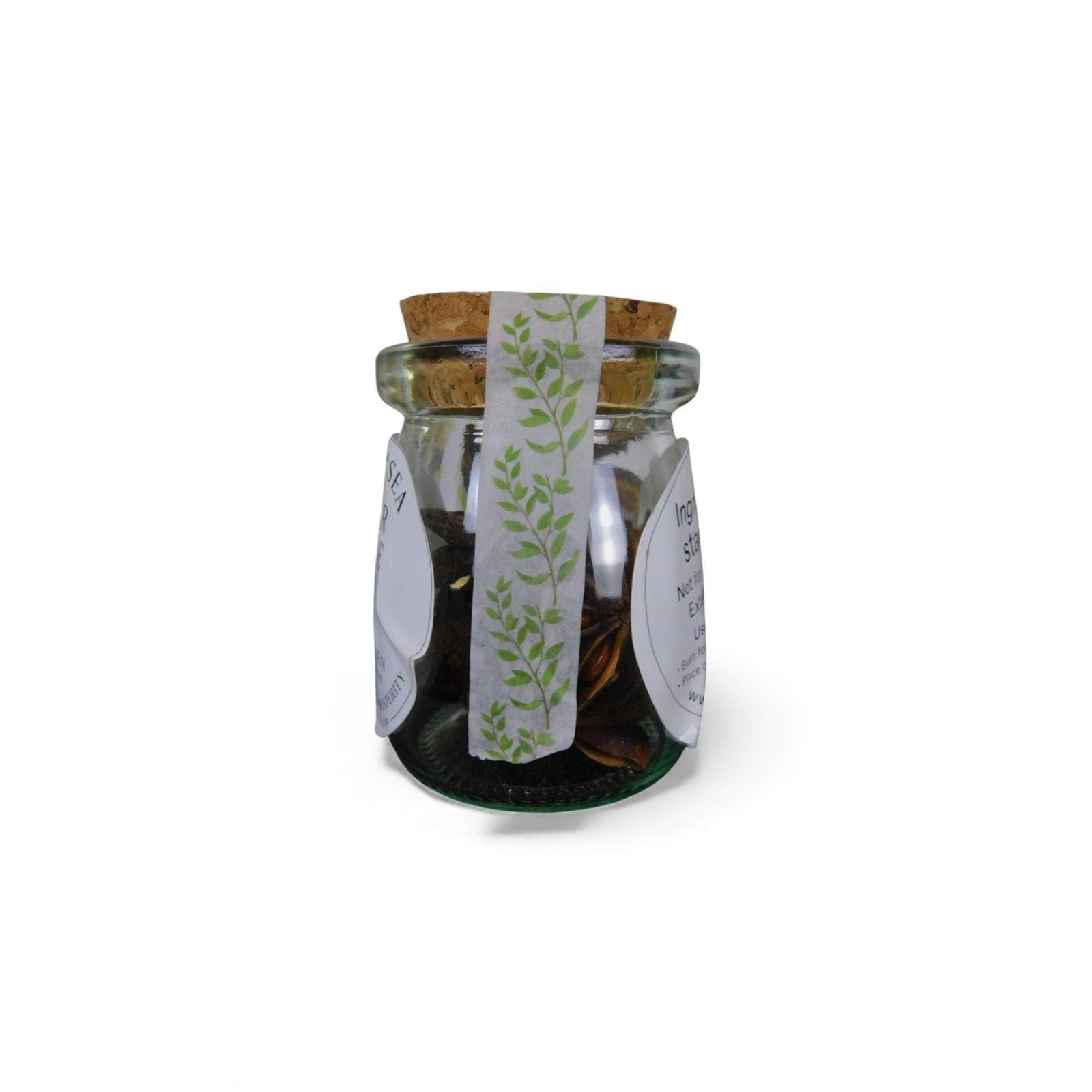 Color: Clear glass jar with natural brown star anise, white labels, tan cork, and green leaf-pattern seal