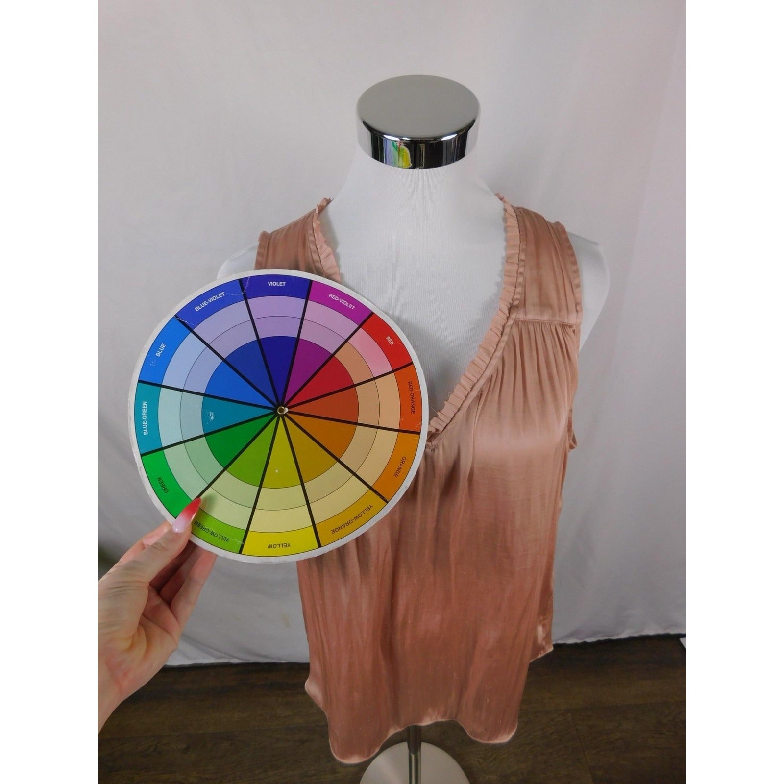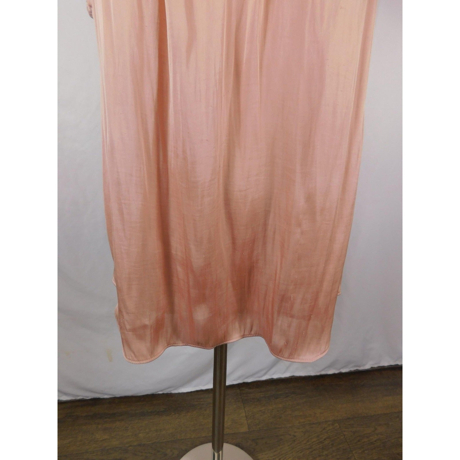 Drift through twilight spells in this pre-owned Banana Republic women’s M blush pink satin blouse (24" long, 19" pit-to-pit)—liquid sheen flows from V-neck with delicate ruffle trim, shirred shoulders & back add Victorian softness. Lightweight 100% polyester drapes like moonlit silk; perfect for layered rites or solo glamour. Elegant & High-Drama essential. The Witches Quest curation.