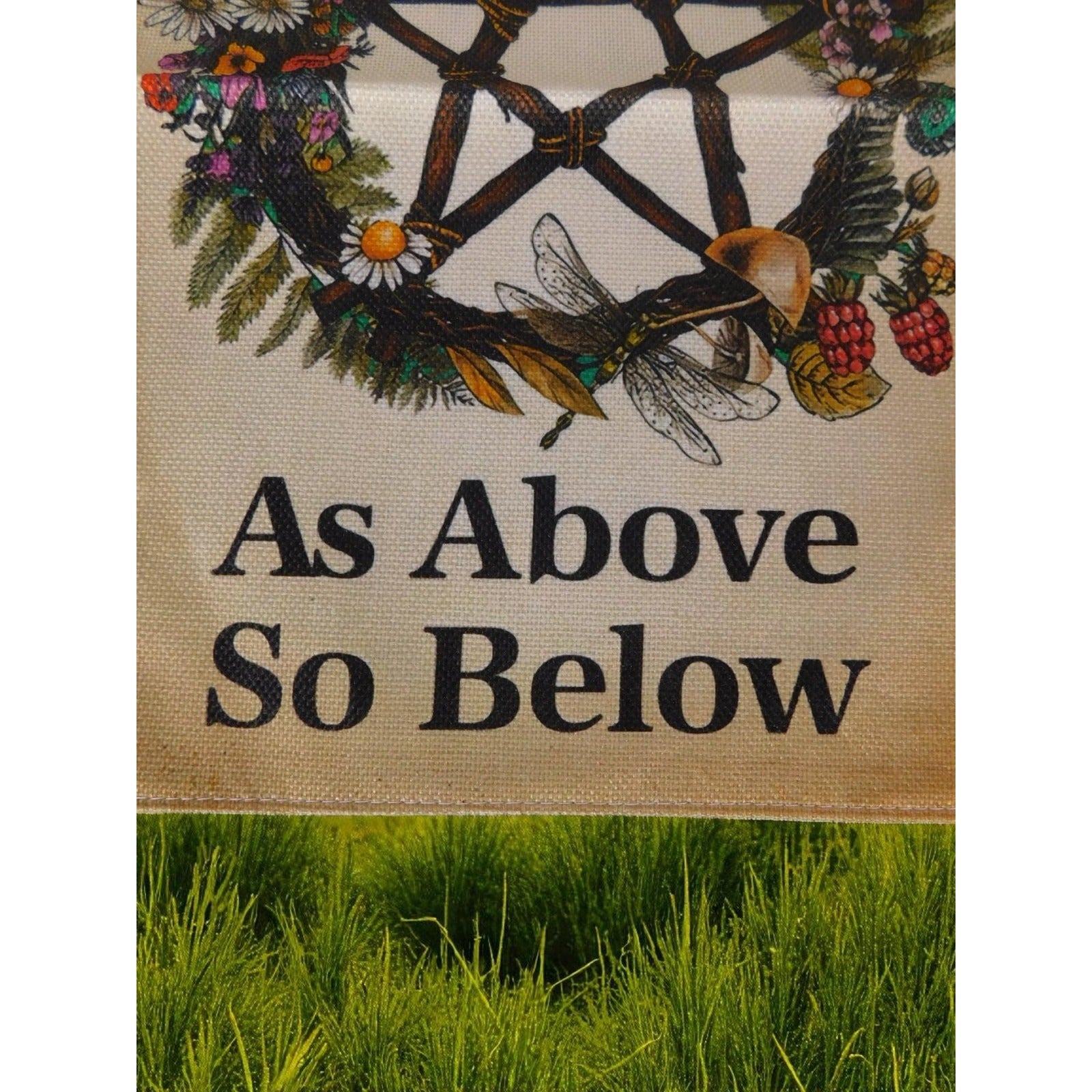 This decorative yard flag features the phrase "Blessed Be As Above So Below" with a detailed pentacle made from illustrated twigs, flowers, plants, mushrooms, berries, and woodland motifs.