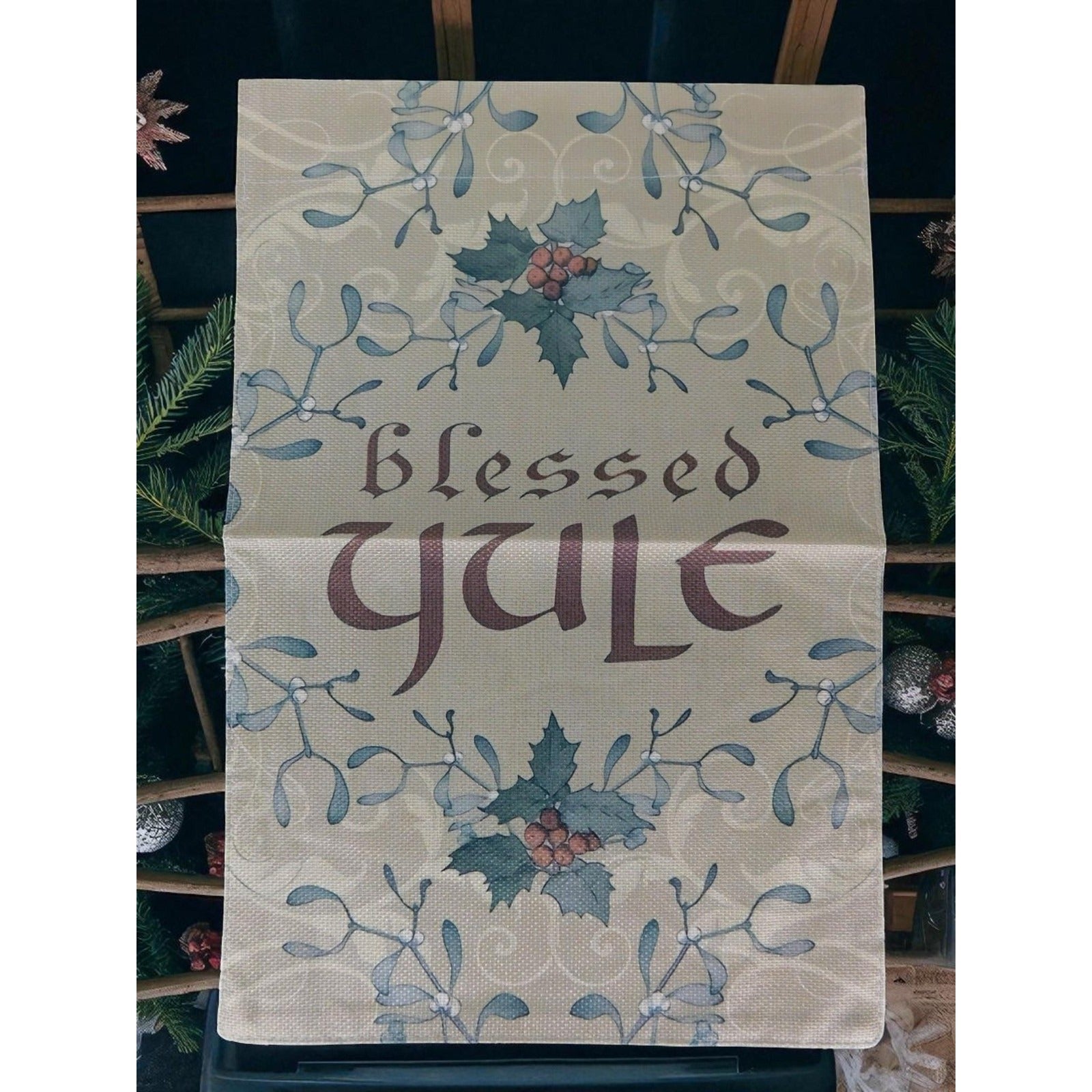 This decorative garden flag features "Blessed Yule" in ornate script with detailed holly and mistletoe illustration, perfect for celebrating Yule or the Winter Solstice season.