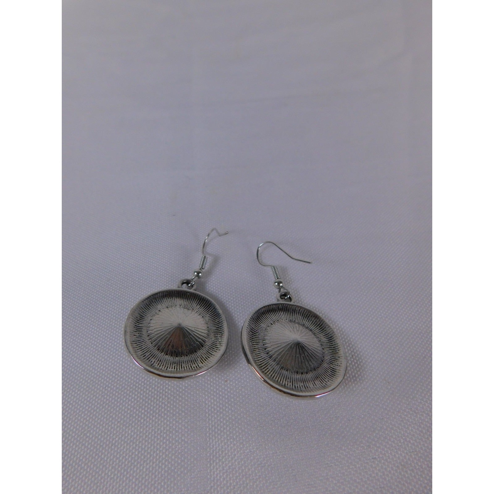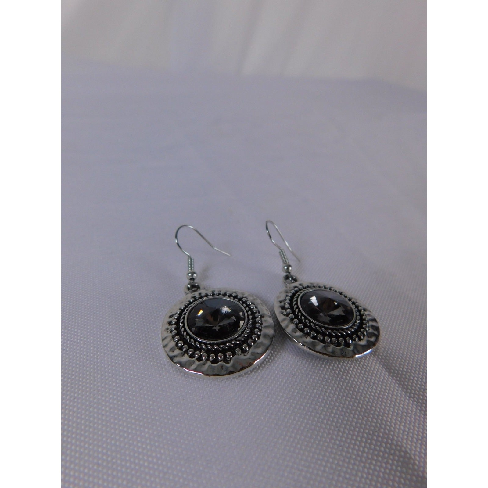 Round hammered silver tone dangle earrings with ornate beaded edging and large black faceted central stones