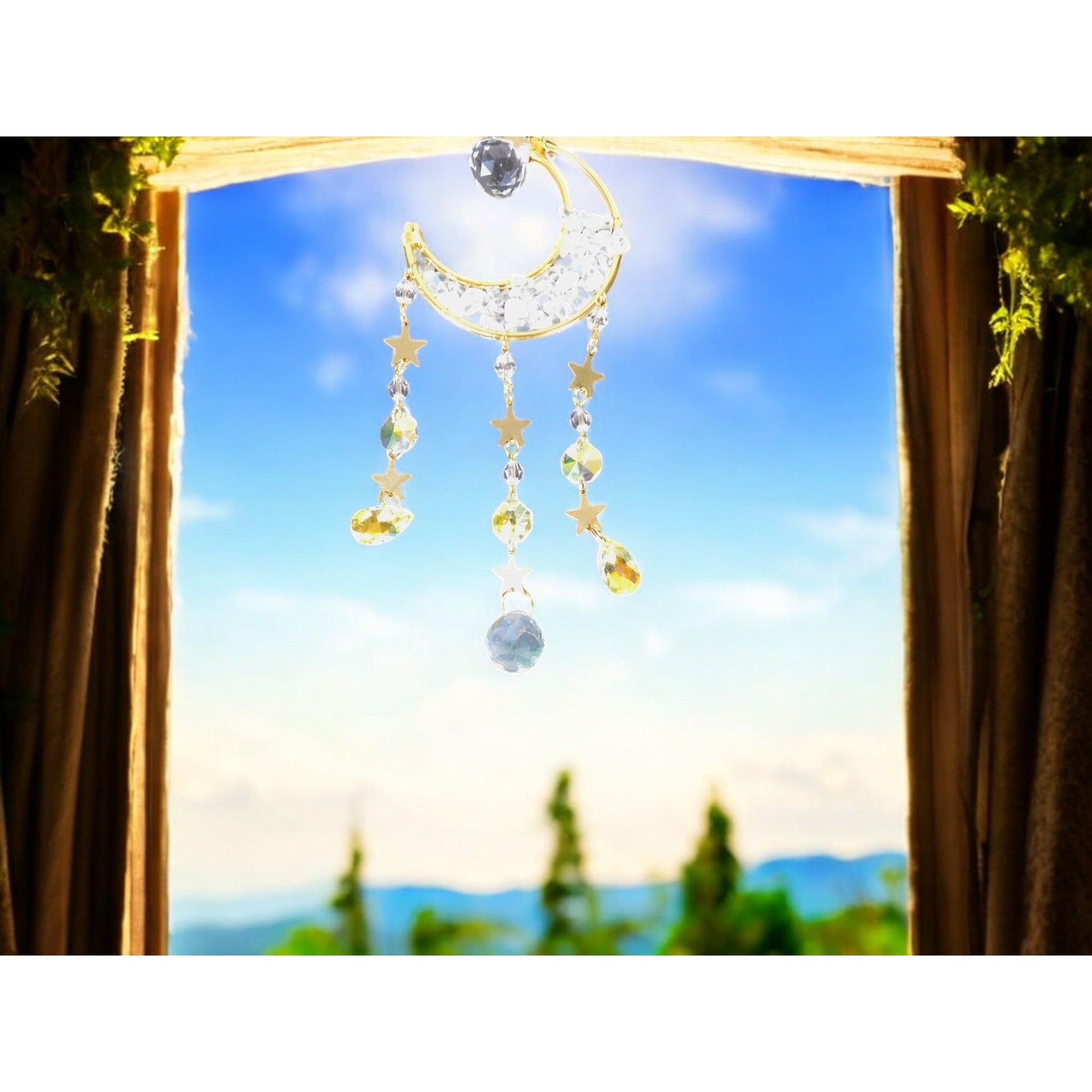 Illuminate your space with the enchanting beauty of this crescent moon crystal suncatcher, designed to scatter dazzling prisms of light throughout your home. This celestial-inspired hanging decor features clear crystals, gold-tone stars, and cascading charms, making it the perfect addition to bohemian, spiritual, or mystical settings.