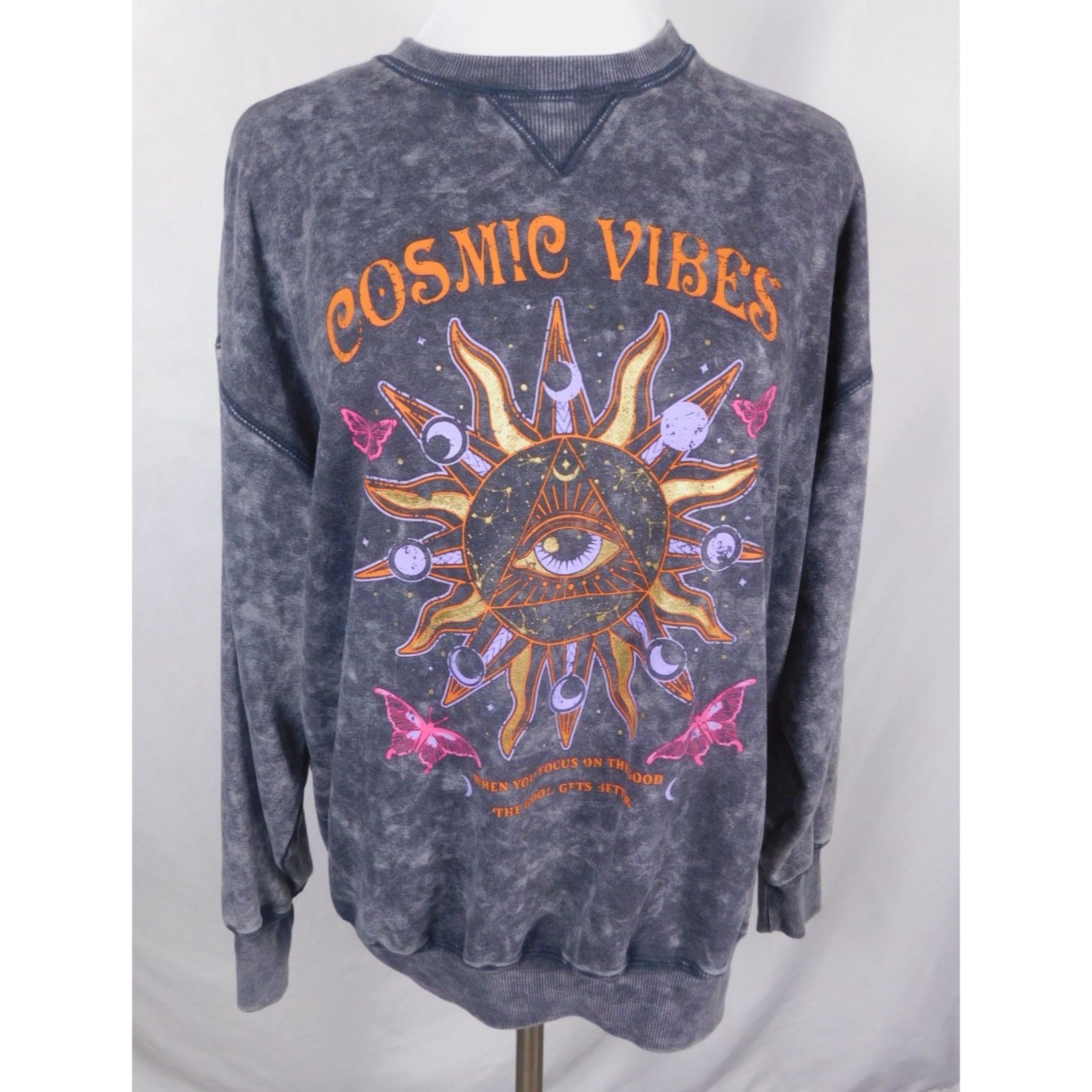 Radiate energy with this celestial-themed Cosmic Vibes sweatshirt in a vintage black acid wash. Featuring a radiant sun and all-seeing eye graphic, surrounded by planets, butterflies, and moon phases, this top is a must for modern mystics and cosmic seekers. The faded mineral wash gives it an aged, witchy patina perfect for Witchcore, Celestial Witch, and Boho Witch wardrobes.