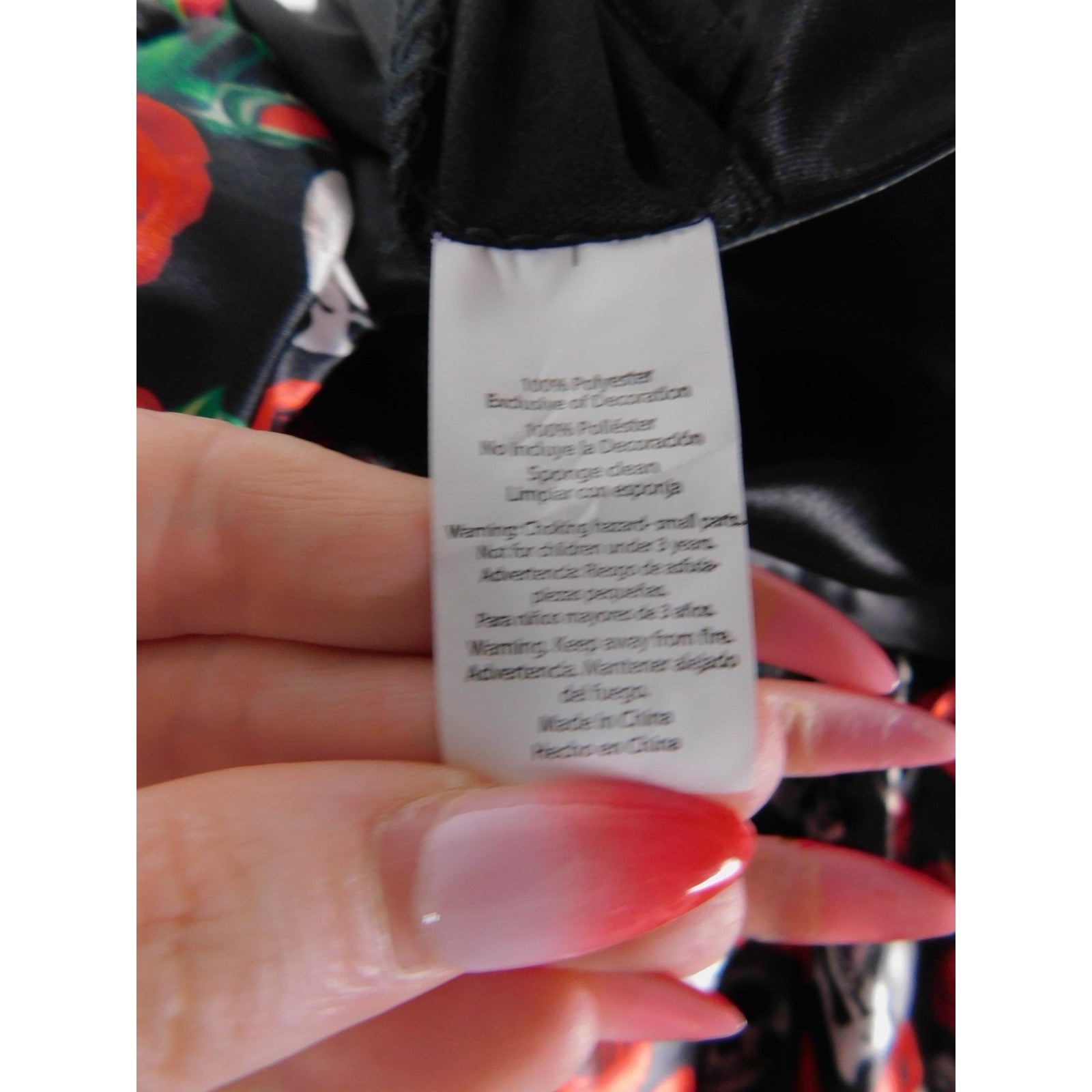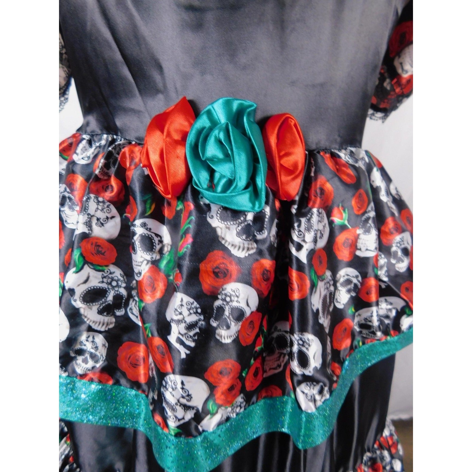 Colors/accents: Black base with red roses and white sugar skulls; teal/green glitter trim; red and teal satin rosettes at waist; blue sequin piping and lace trim at neckline.