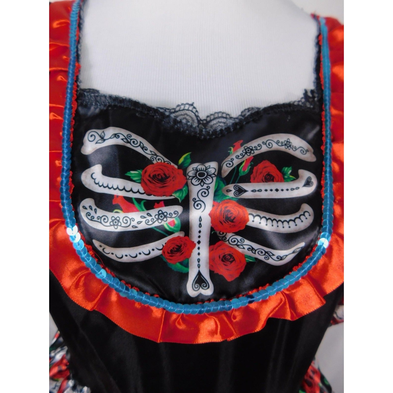 Item: Women's Day of the Dead (Dia de los Muertos) costume dress featuring a printed ribcage bodice, sugar skull and red rose print, and a tiered ruffle skirt.