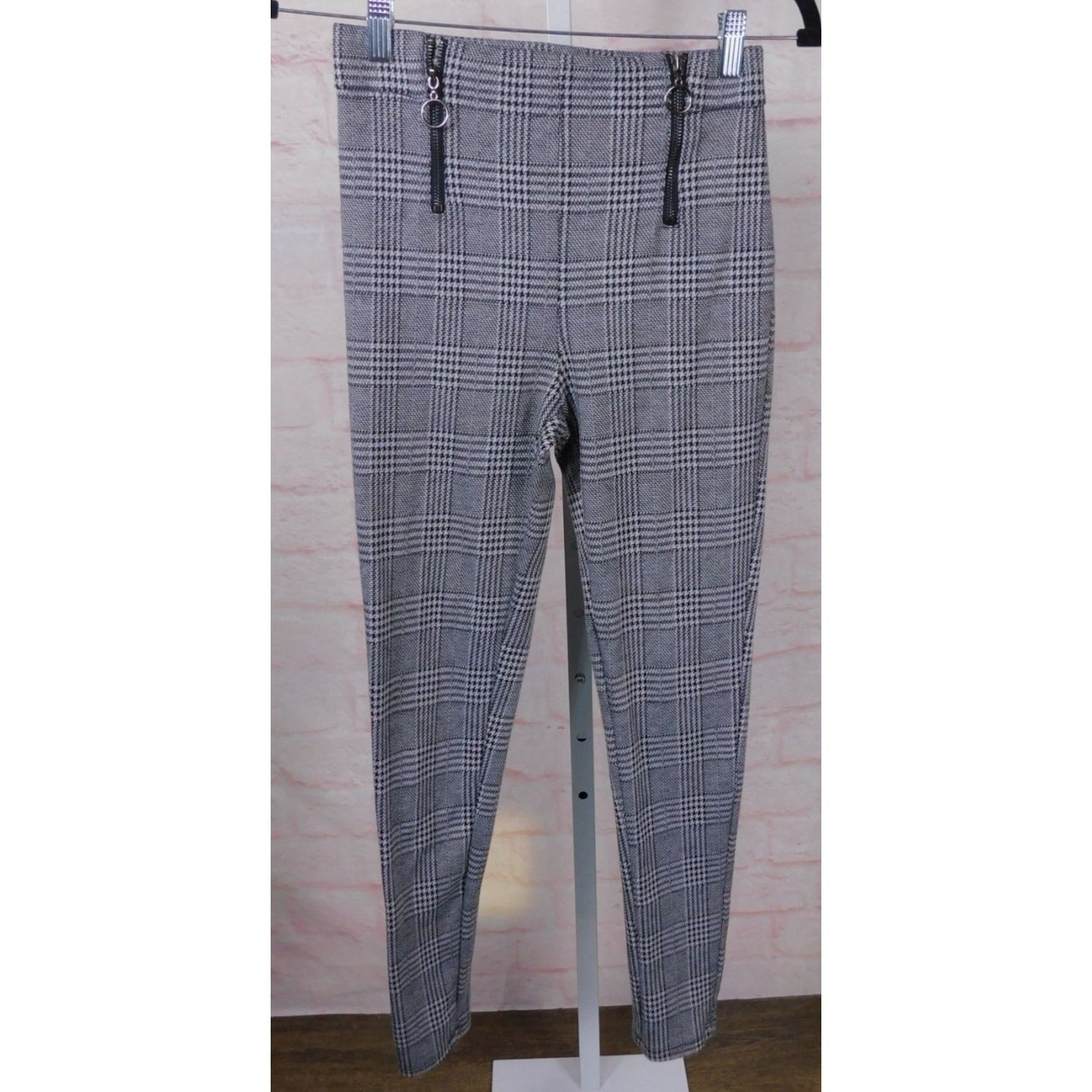 Summon dark-academia coven energy in these pre-owned Fashion Nova women’s S plaid high-waist pants — black & white tartan stretch blend hugs curves, edgy silver zipper accents at pockets, 28" inseam, 38" total length. Perfect for witchy office looks, Yule gatherings, or layering under oversized sweaters.