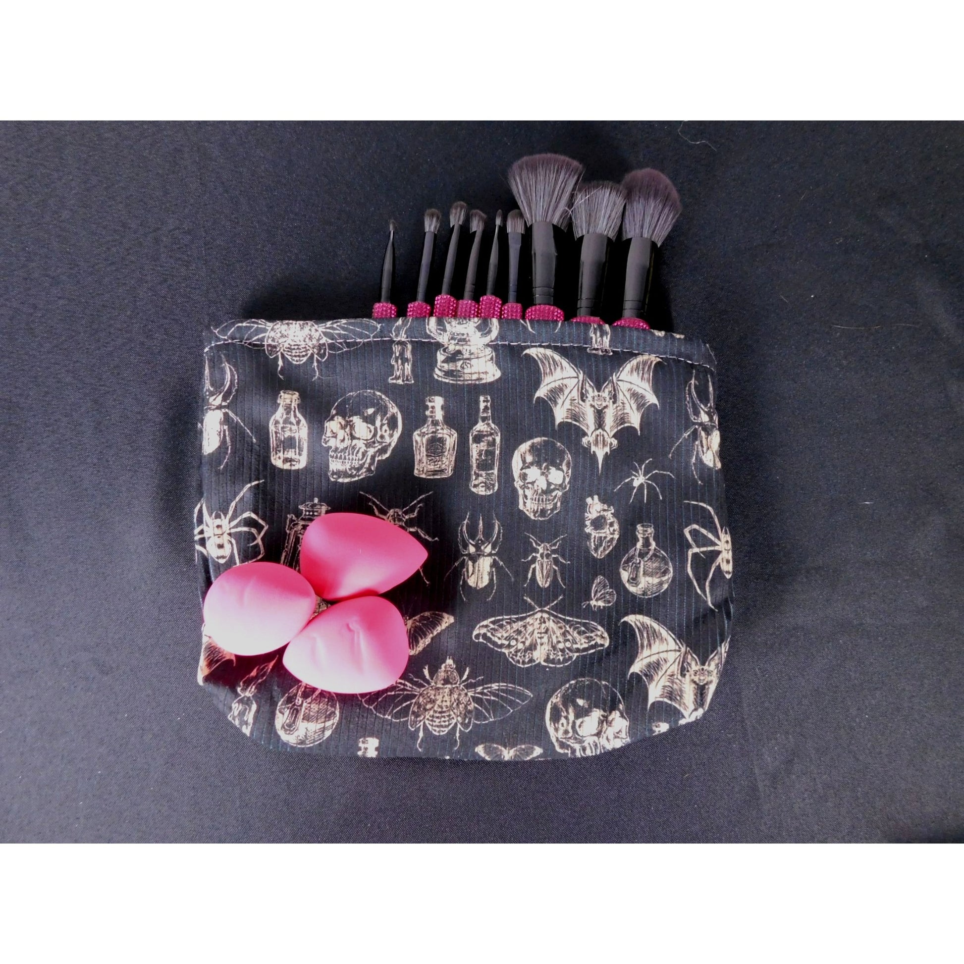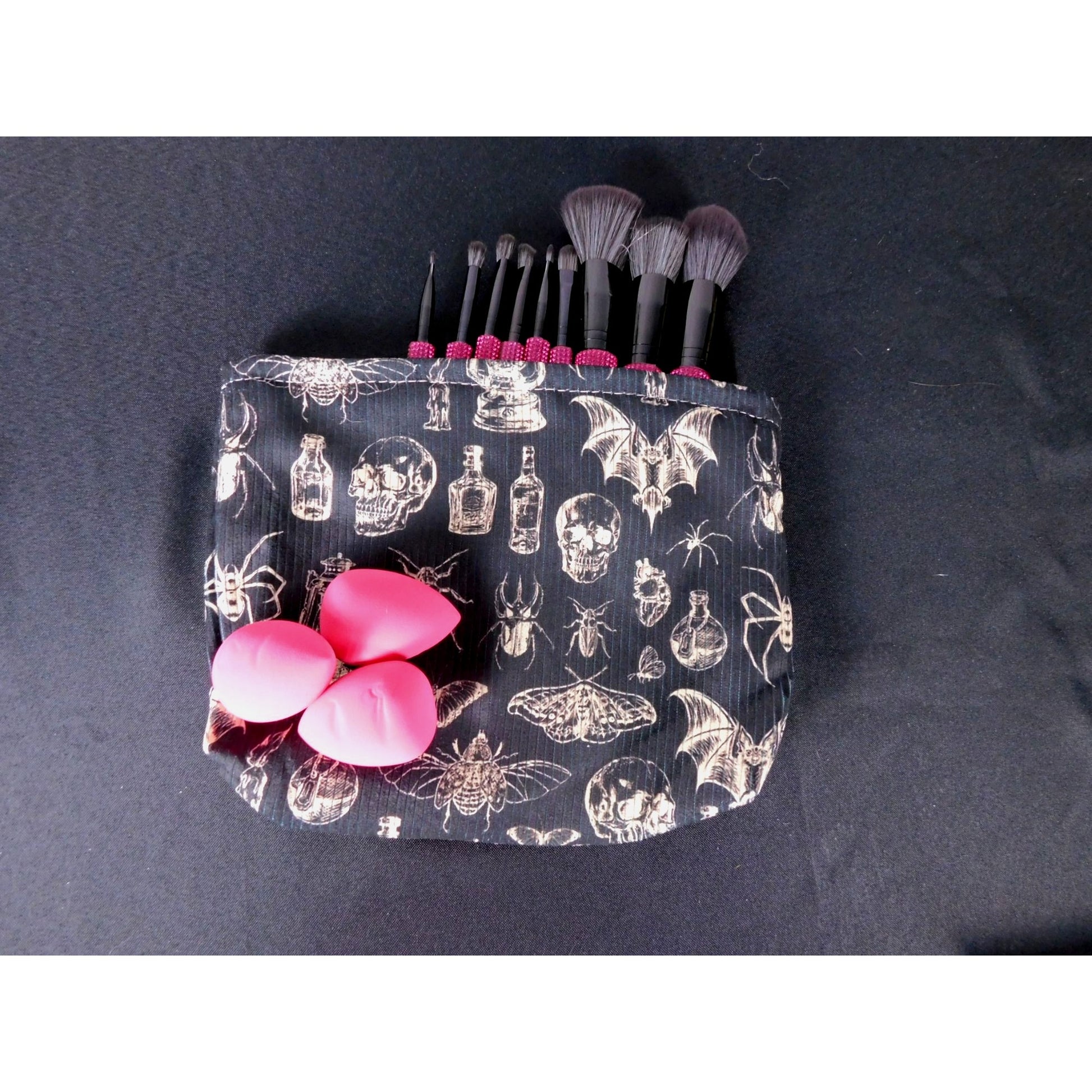 This stunning gothic-inspired makeup bag features a detailed apothecary-style print, complete with skulls, bats, spiders, lanterns, and potion bottles. Crafted with a cloth exterior and a vinyl-lined interior, it's both stylish and practical for travel or home use.