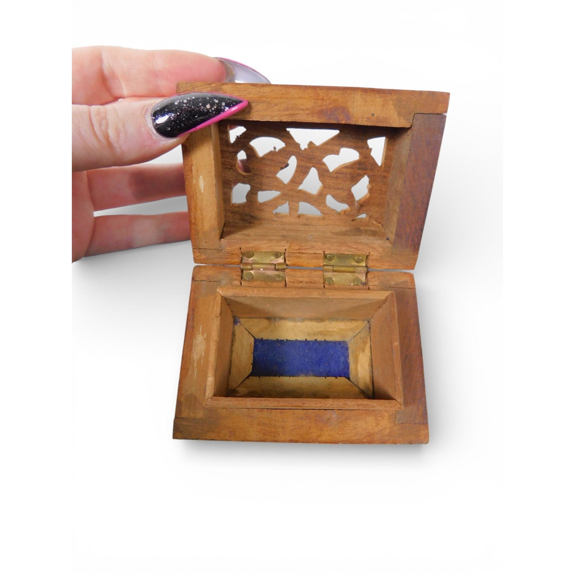 Hand Carved Wooden Trinket Box Pierced Lid Vintage Folk Art
