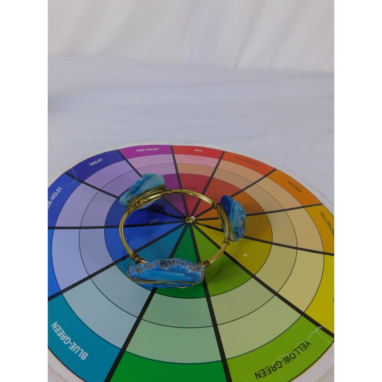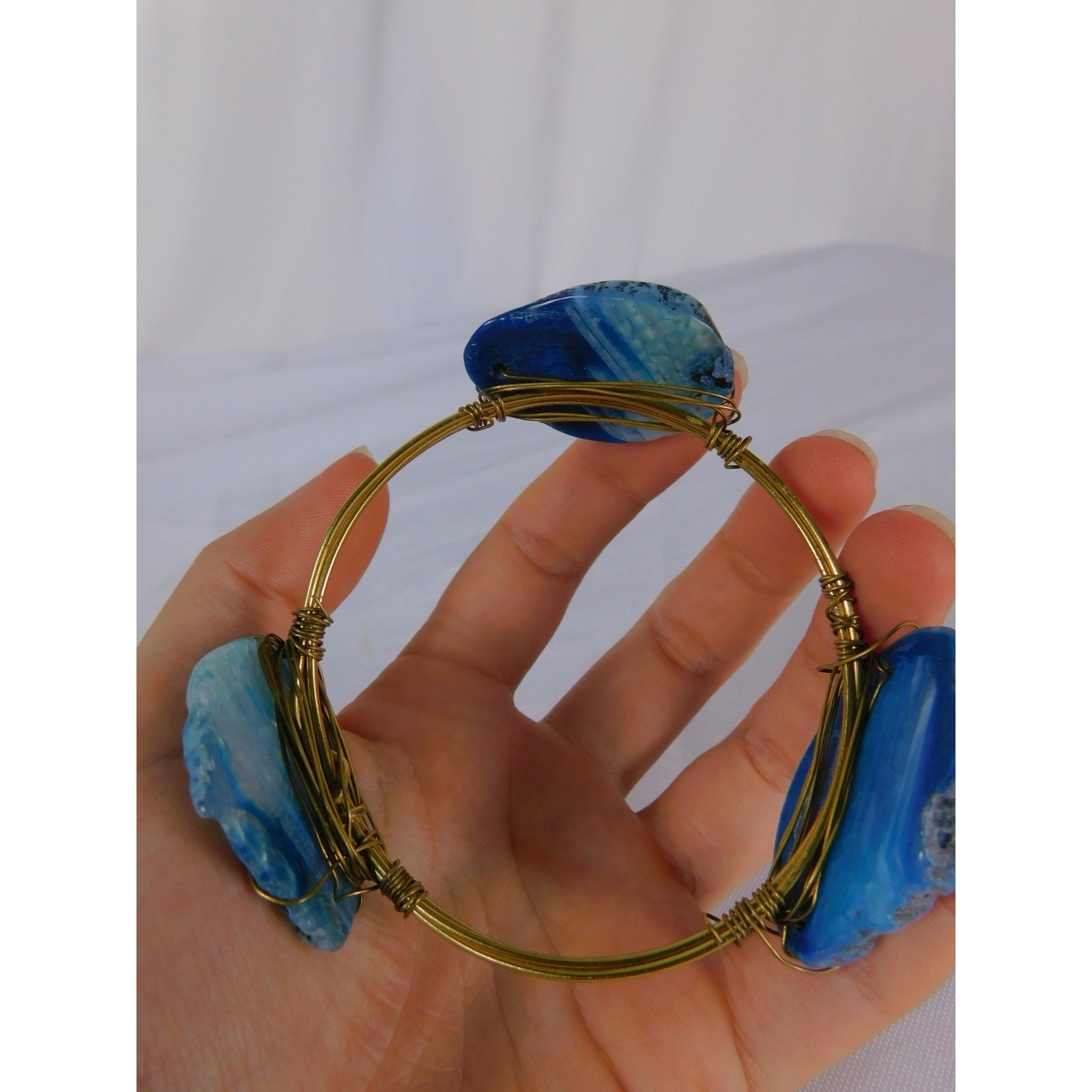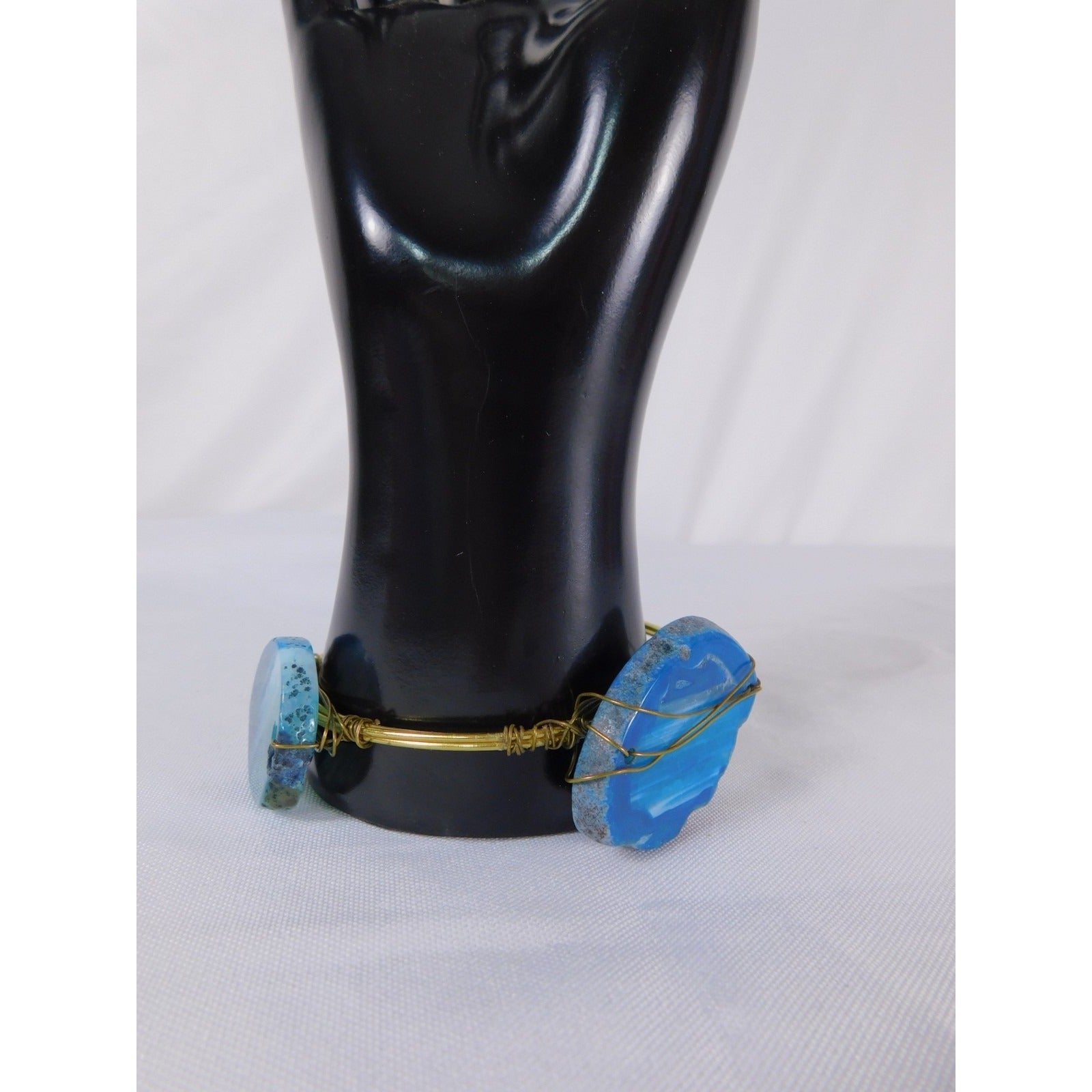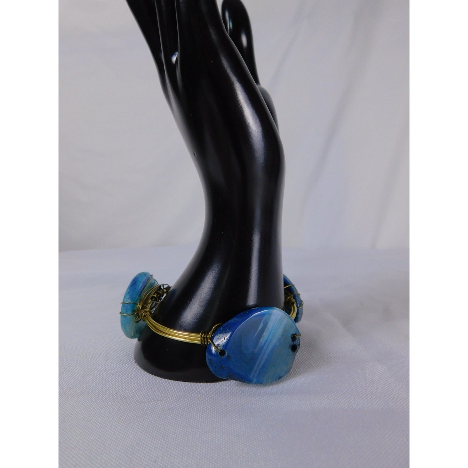 Handmade Bangle Bracelet Blue Agate Wire Wrapped Gold Tone Boho Statement Jewelry
