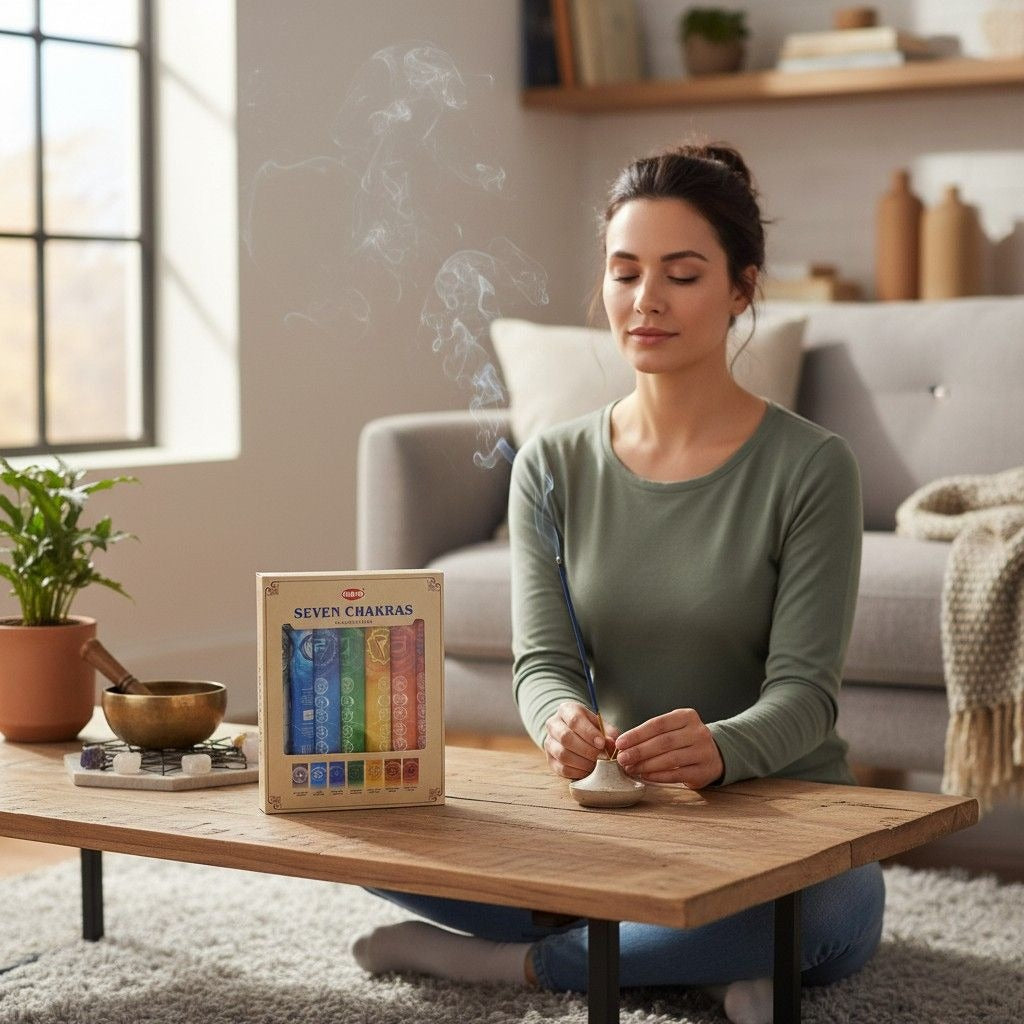 Brand-new sealed HEM Seven Chakras Gift Set – 7 full hex tubes (20 sticks each = 140 total) of premium Indian incense, one for each chakra:
