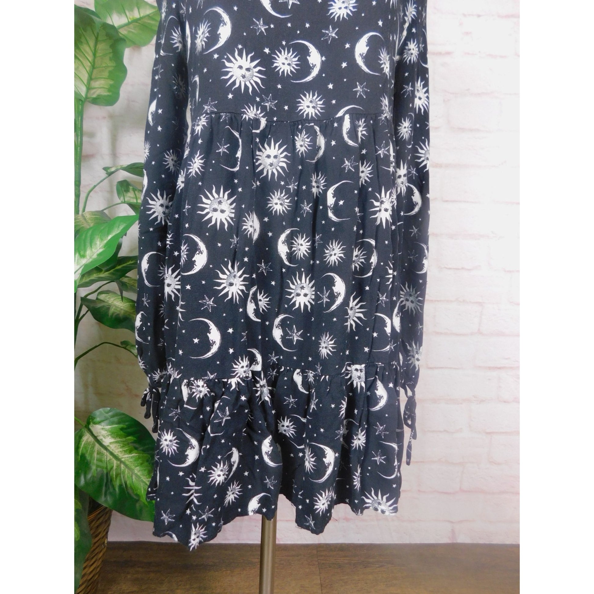 Hot Topic size S black babydoll dress with white celestial sun, moon, and star print. Long sleeves with ruched cuffs and tiered ruffle hem. Soft, flowy 100% rayon. Estimated measurements: 17” pit to pit, 33” length. Good pre-owned condition, minimal wear.