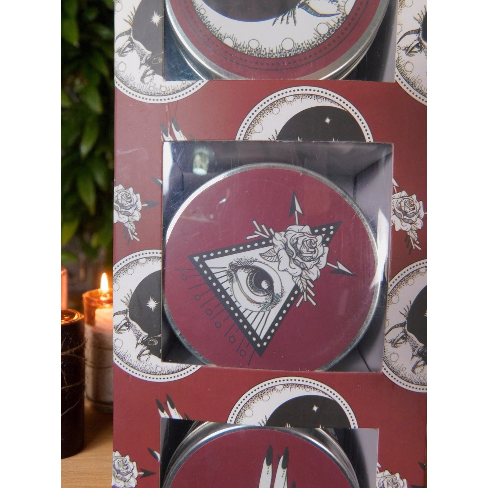 Set of 3 scented travel tin candles beautifully packaged with mystic motif artwork: moon and stars, all-seeing eye, and hand illustration