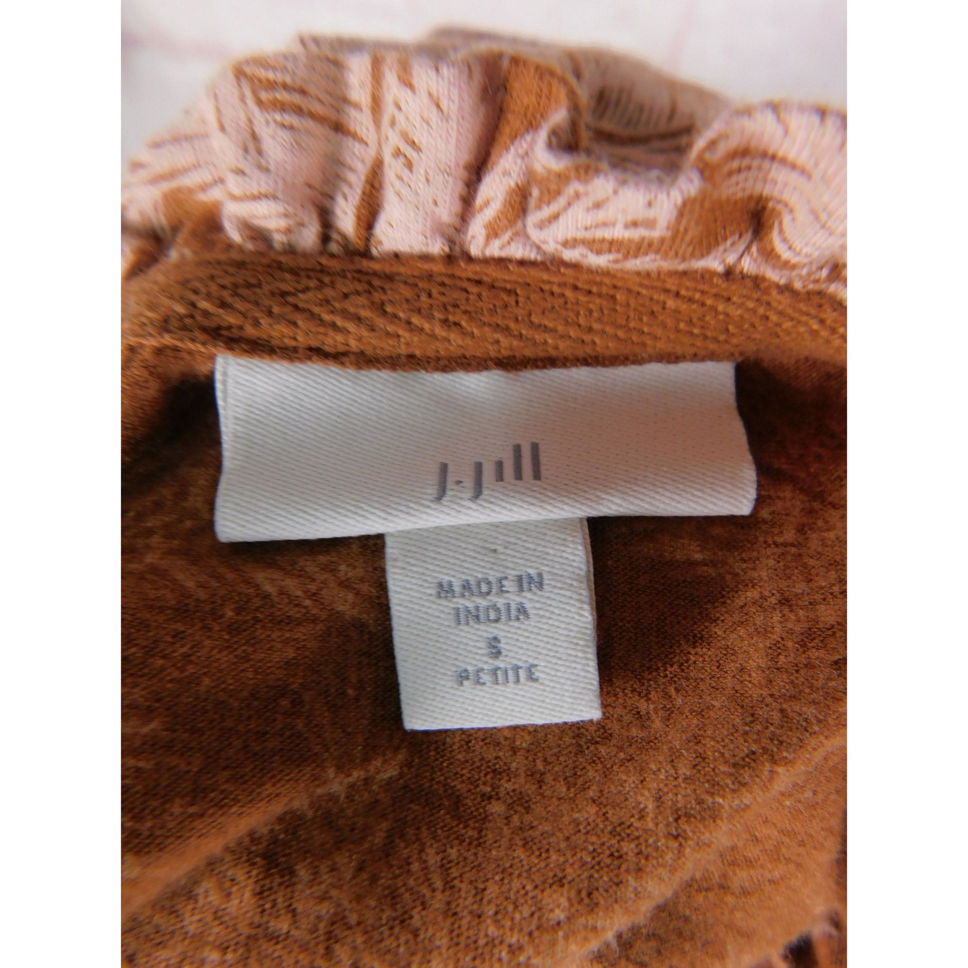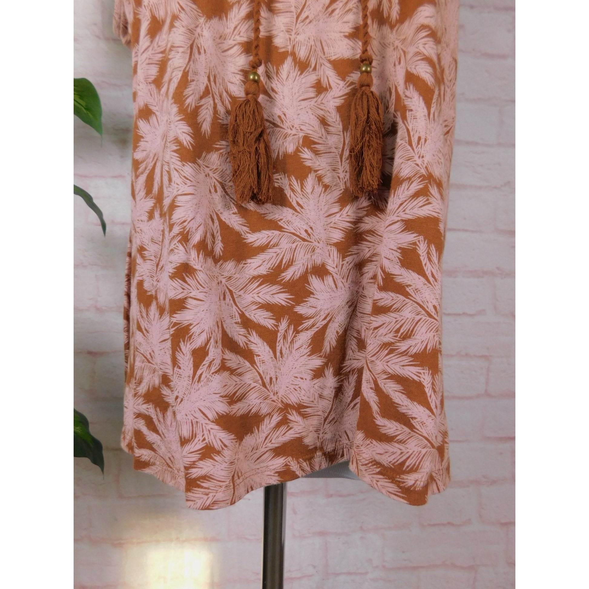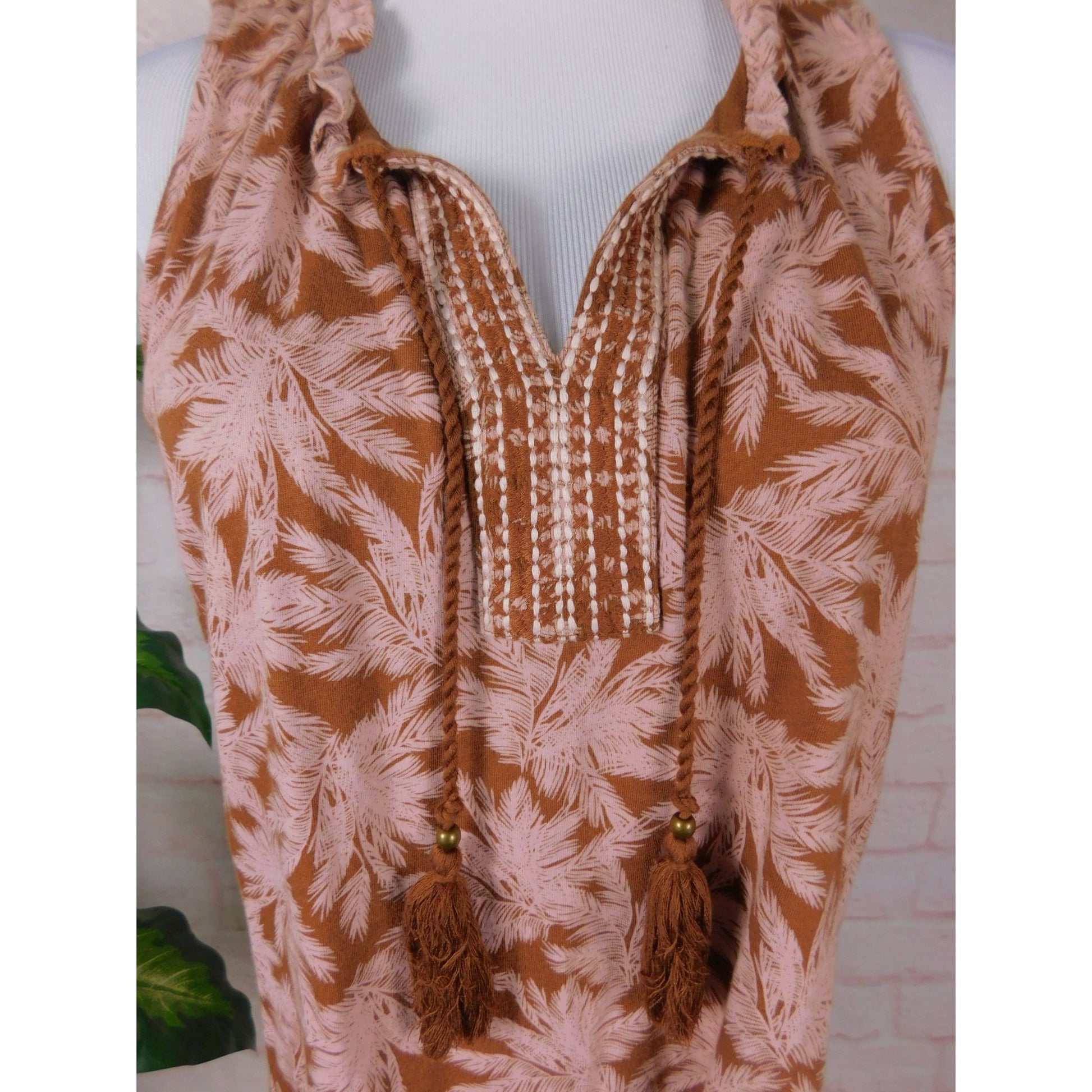 J Jill Petite sleeveless boho blouse size Small Petite. Lightweight blend of 60% cotton and 40% TENCEL™ modal in a rich brown and soft pink tropical palm leaf print. Features intricate embroidered neckline, front tassel ties with wooden beads, and gathered ruffle collar detail. Flowy relaxed fit perfect for summer, resort, or casual boho aesthetic.