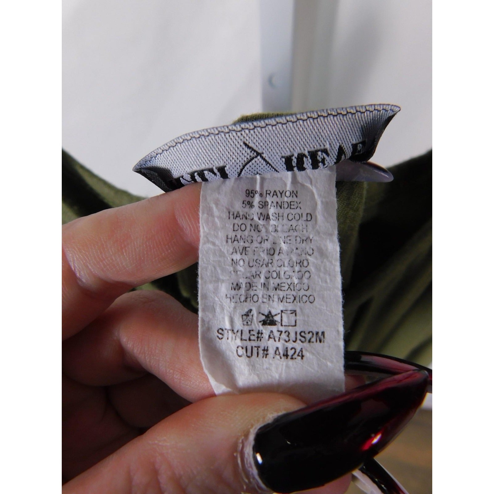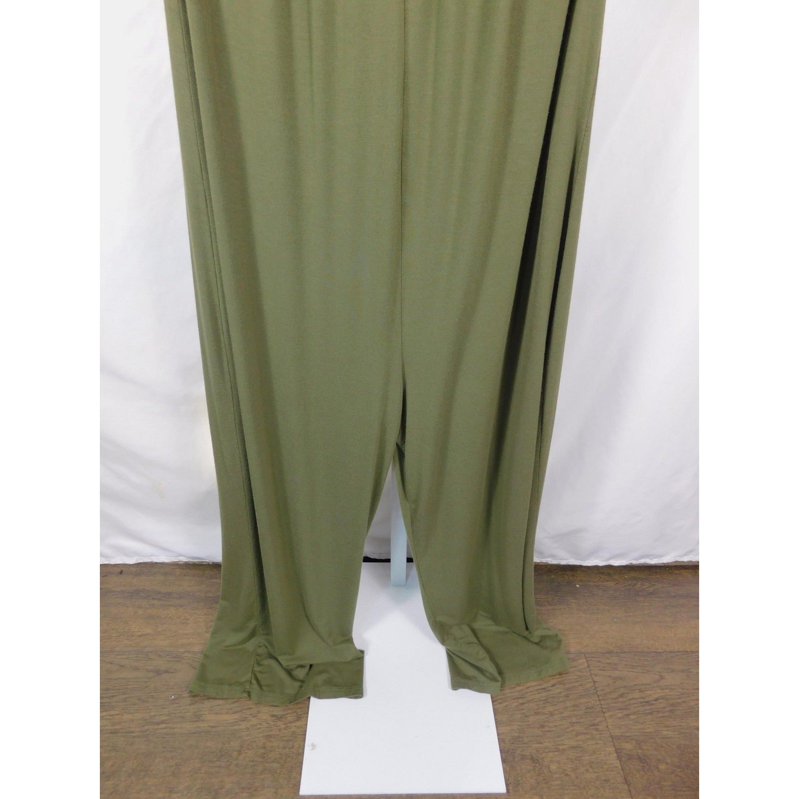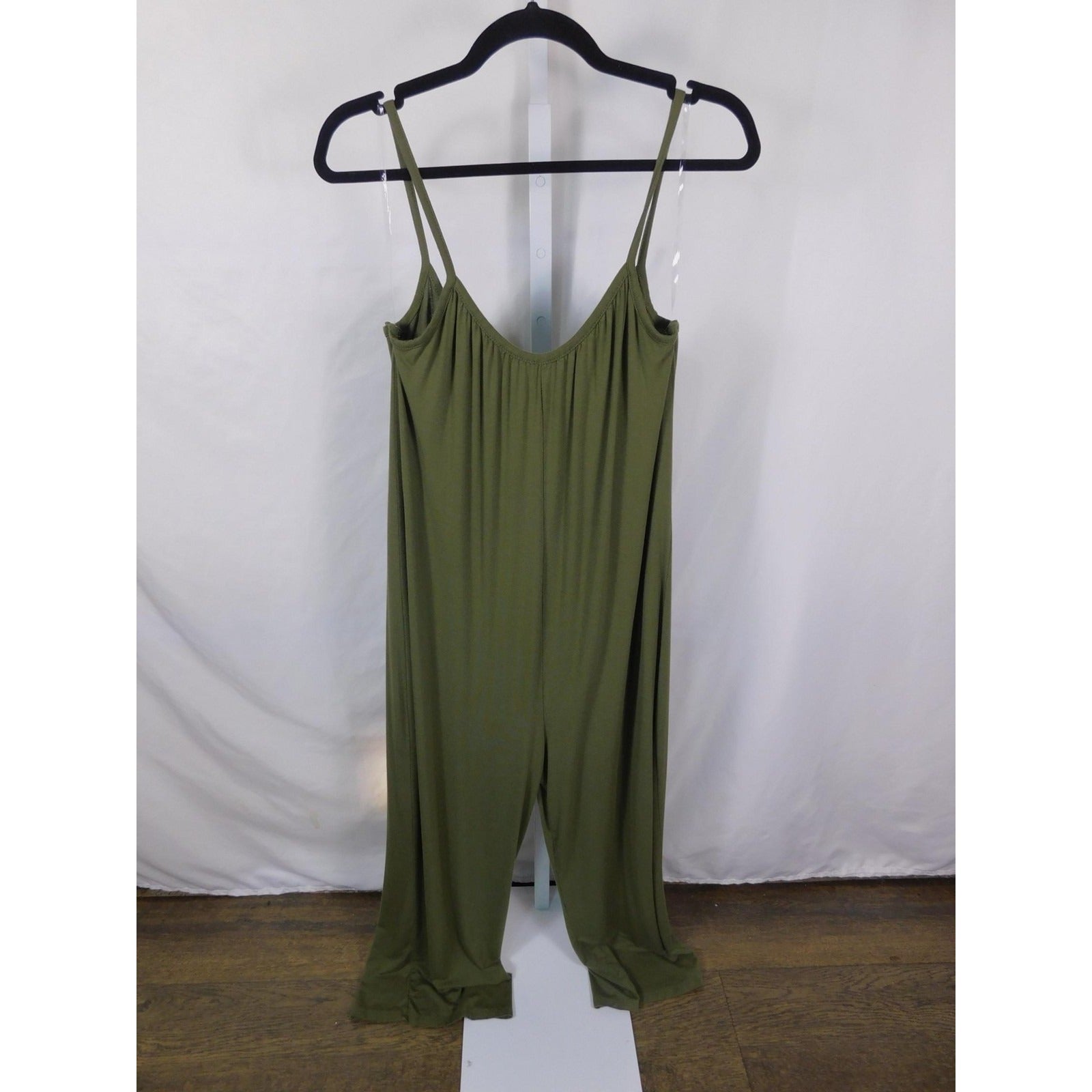 Flow through forest enchantments in this pre-owned Kali Reve olive green jumpsuit (approx 52" long inseam 28")—95% rayon 5% spandex lightweight stretch knit drapes with gathered scoop neck spaghetti straps relaxed wide-leg silhouette pull-on ease. Made in Mexico STYLE A73JS2M; perfect Earth & Nature witch layering or sunlit rituals. The Witches Quest curation.