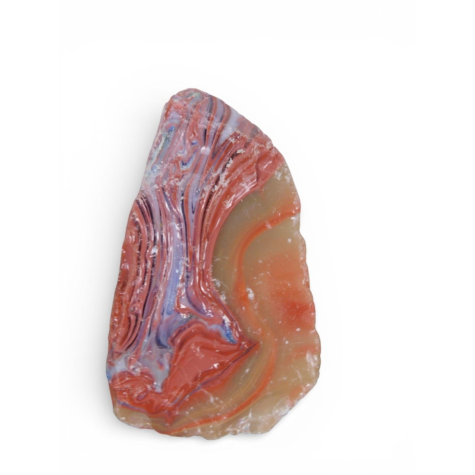 Large freeform agate specimen with natural banding and flowing red, tan, gray, and muted blue tones. This piece appears partially polished with raw, irregular edges, showcasing organic striations, natural pits, and surface variation consistent with an uncut or minimally worked stone. Striking visual movement from multiple angles makes it ideal for shelf, desk, or collection display.