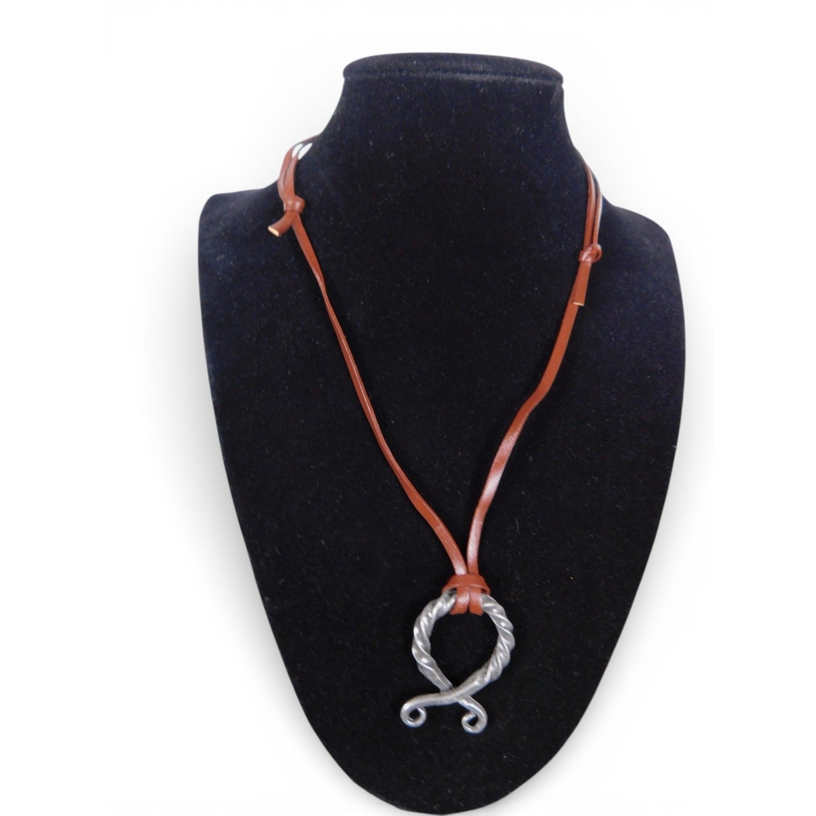 Material: Brown leather cord; silvertone base metal pendant (metal content unmarked/unknown); no stones or additional embellishments.