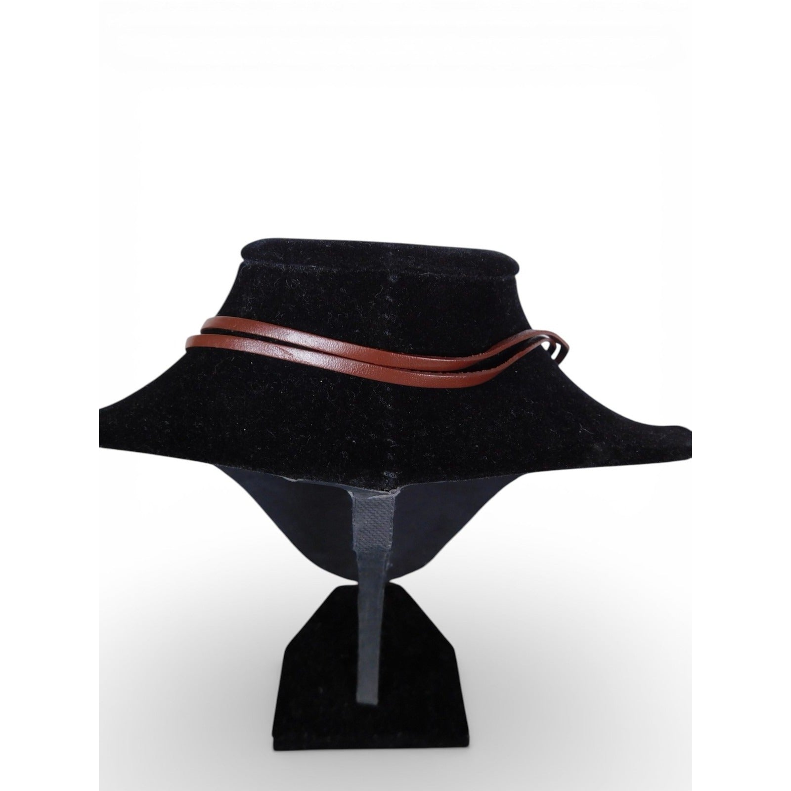 Features: Twisted oval pendant with open center and curled ends, smooth brown leather cord, adjustable length via sliding knots, slip-on design with no traditional clasp, lightweight for everyday wear.