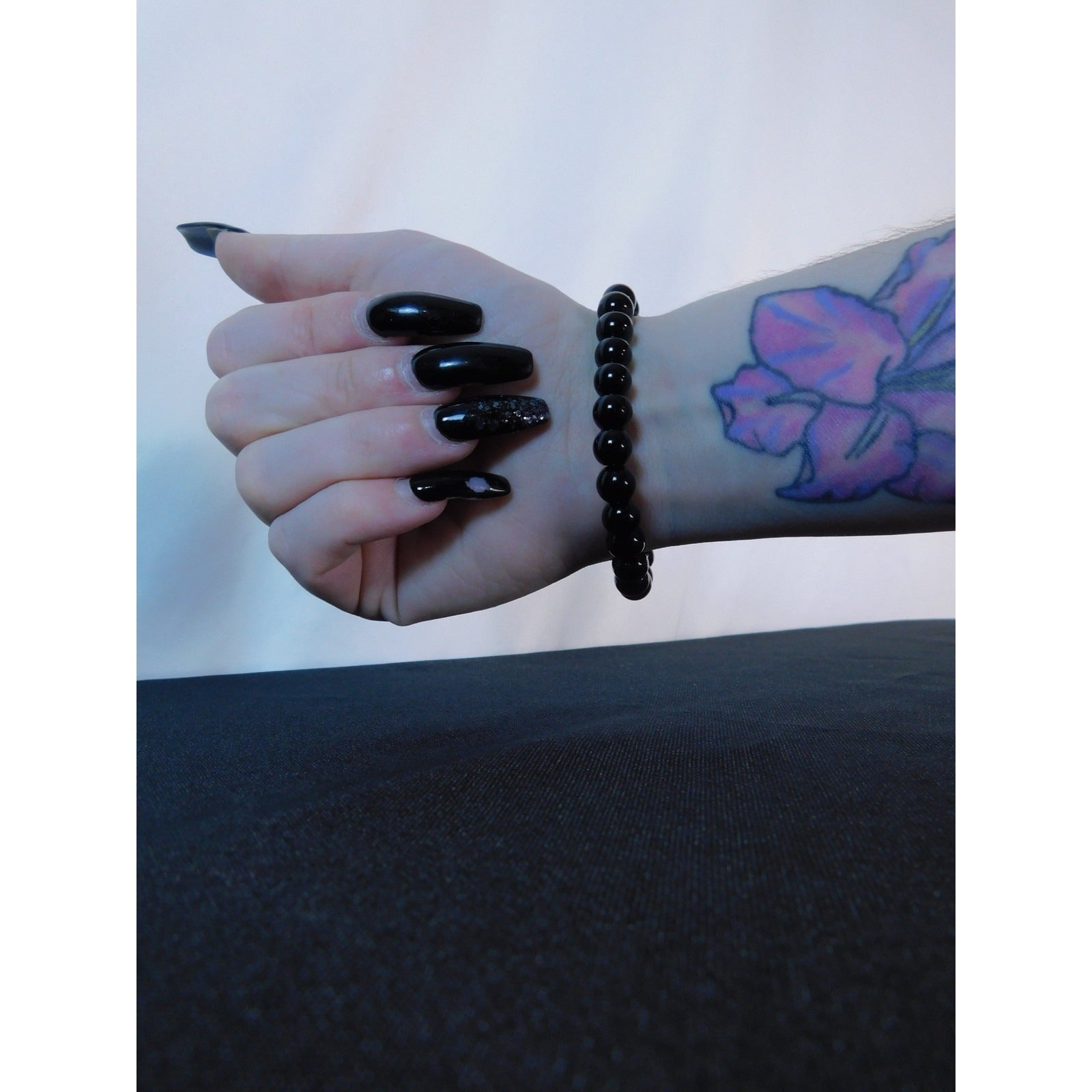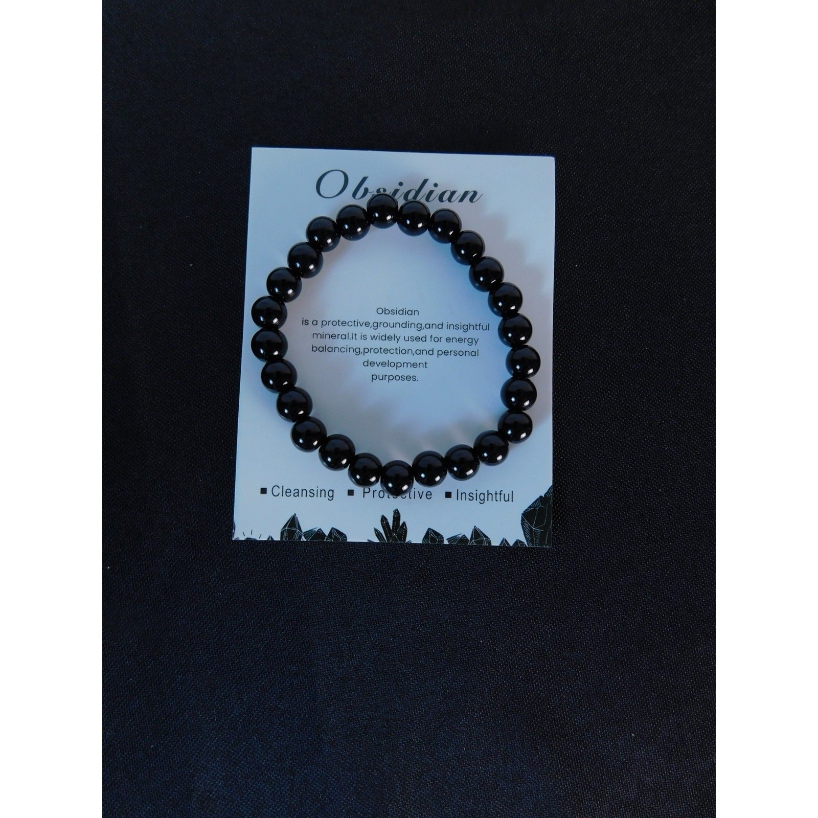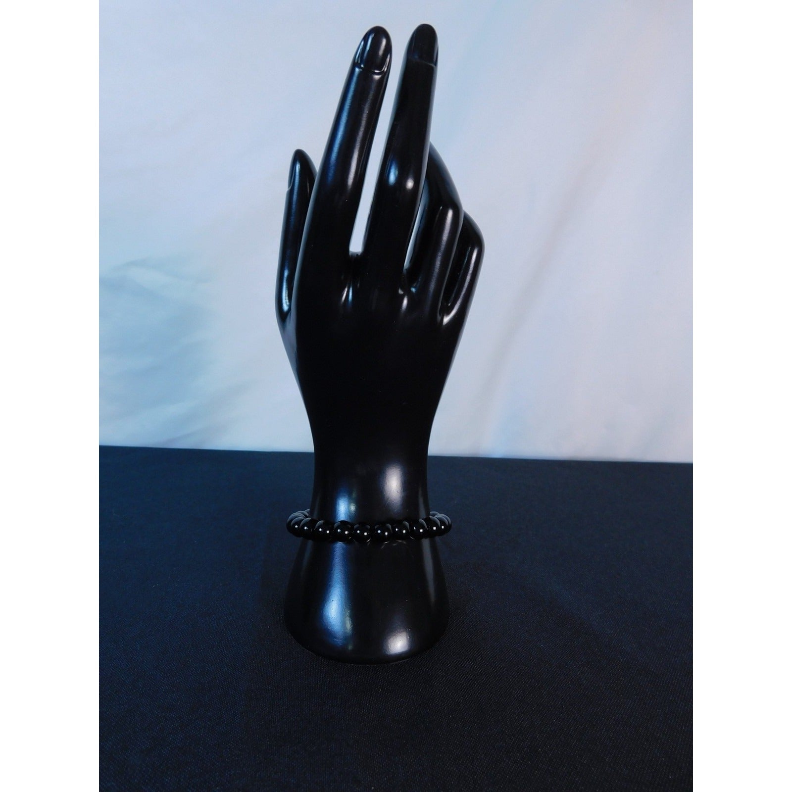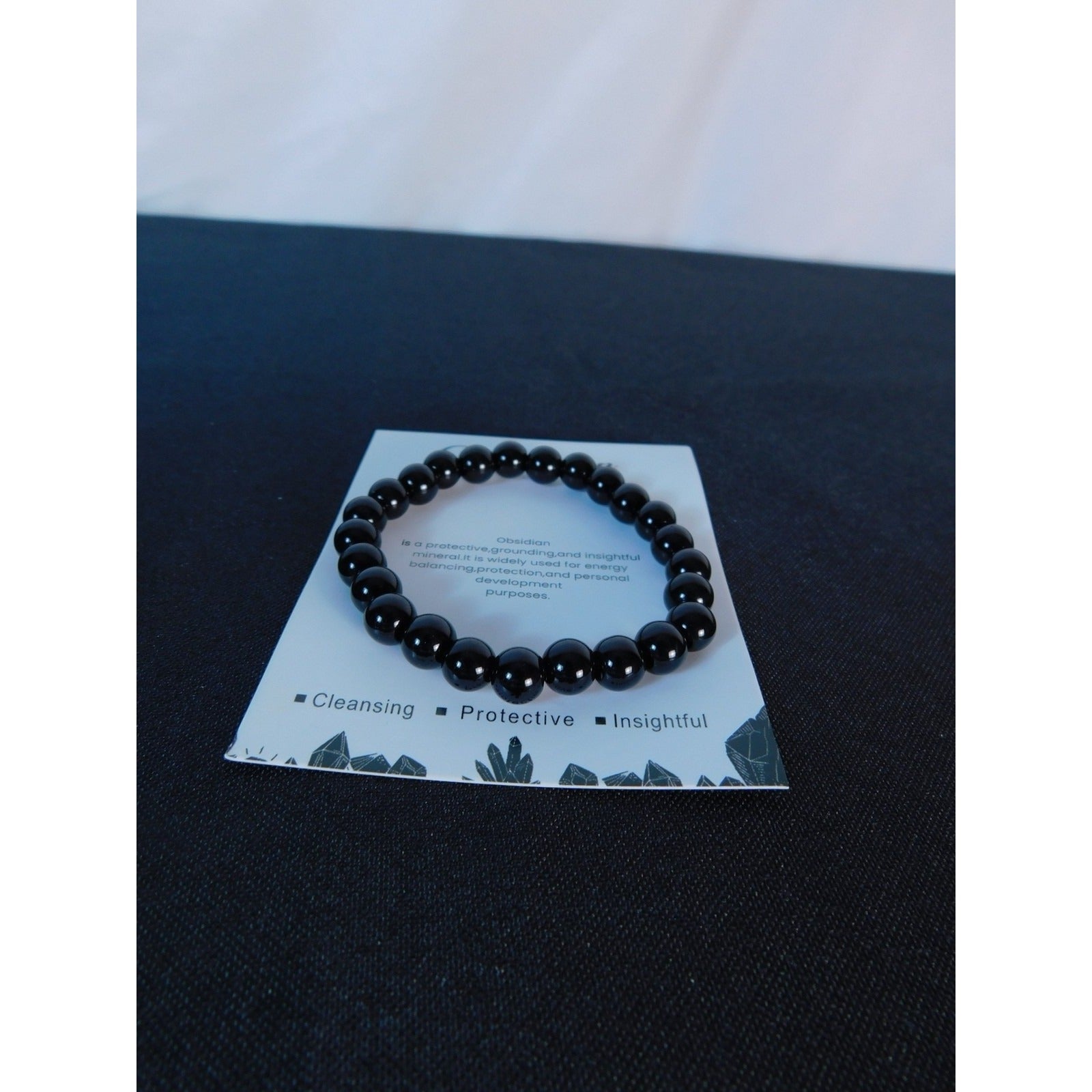 This bracelet is made of round polished black obsidian beads strung on a durable stretch cord for easy, comfortable wear for most wrist sizes.