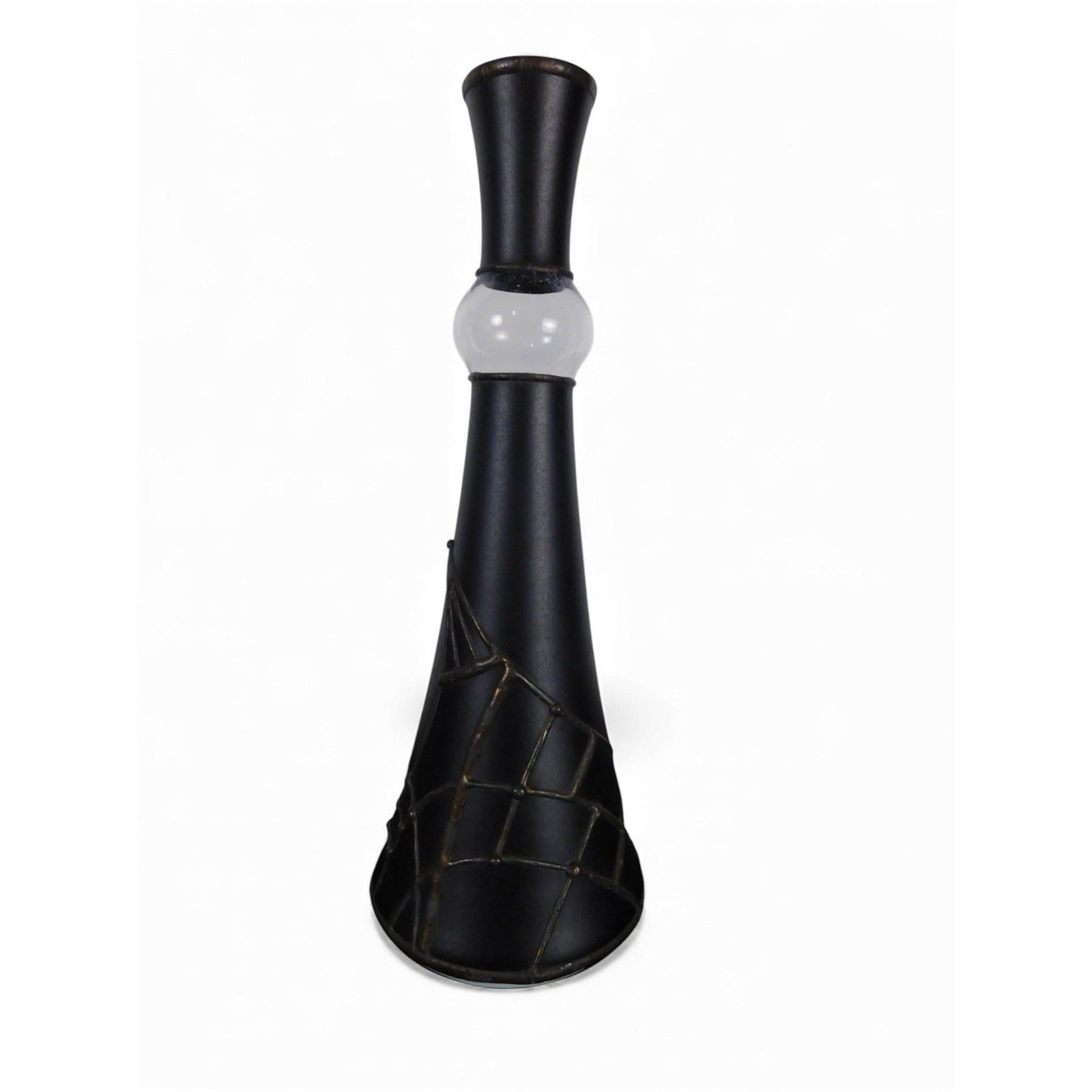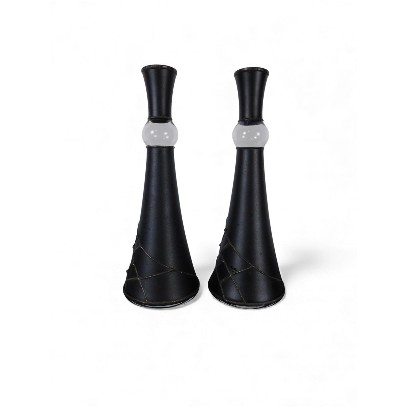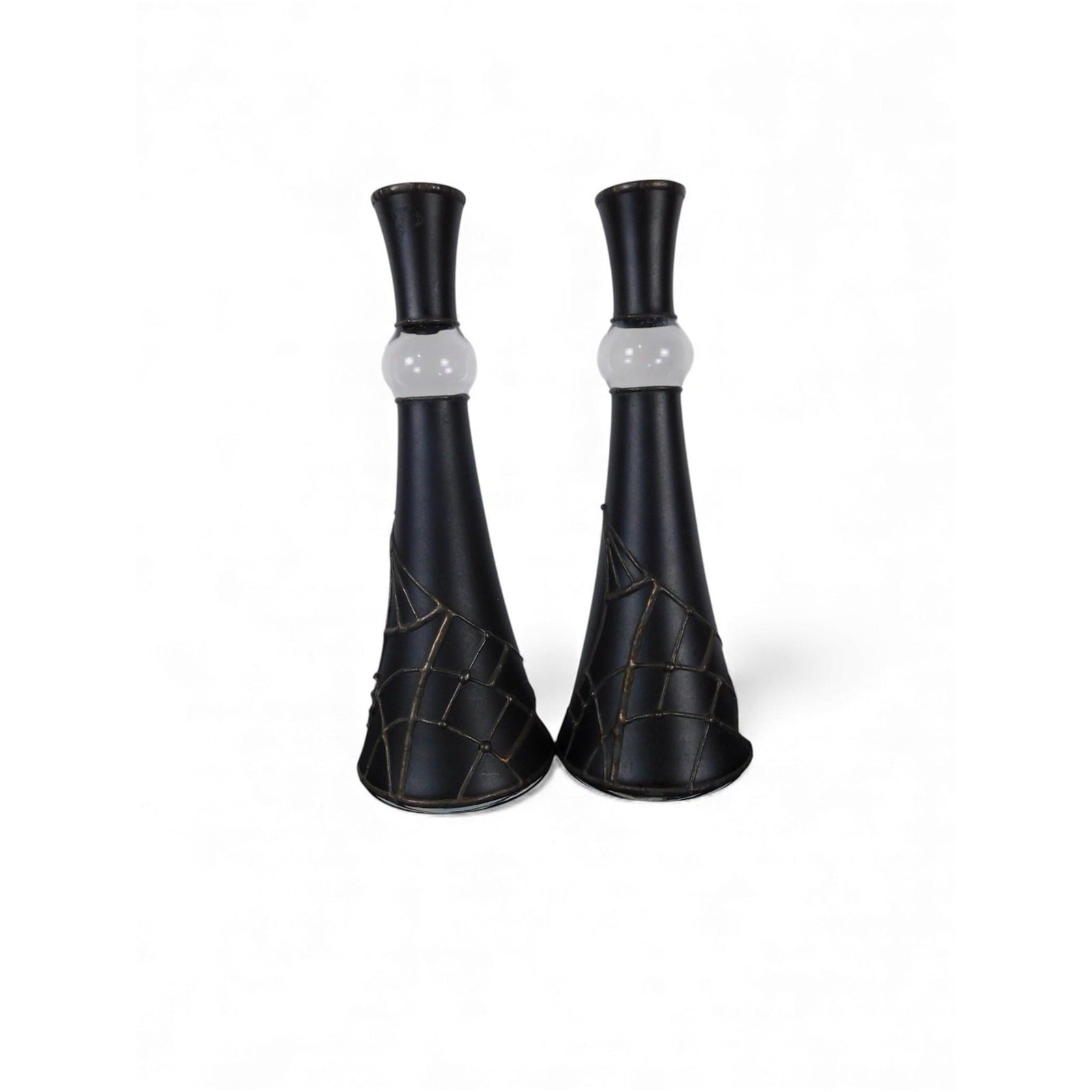 Design: Tall flared black metal bodies with raised geometric web-like pattern near the base and a round white glass orb accent at the neck.