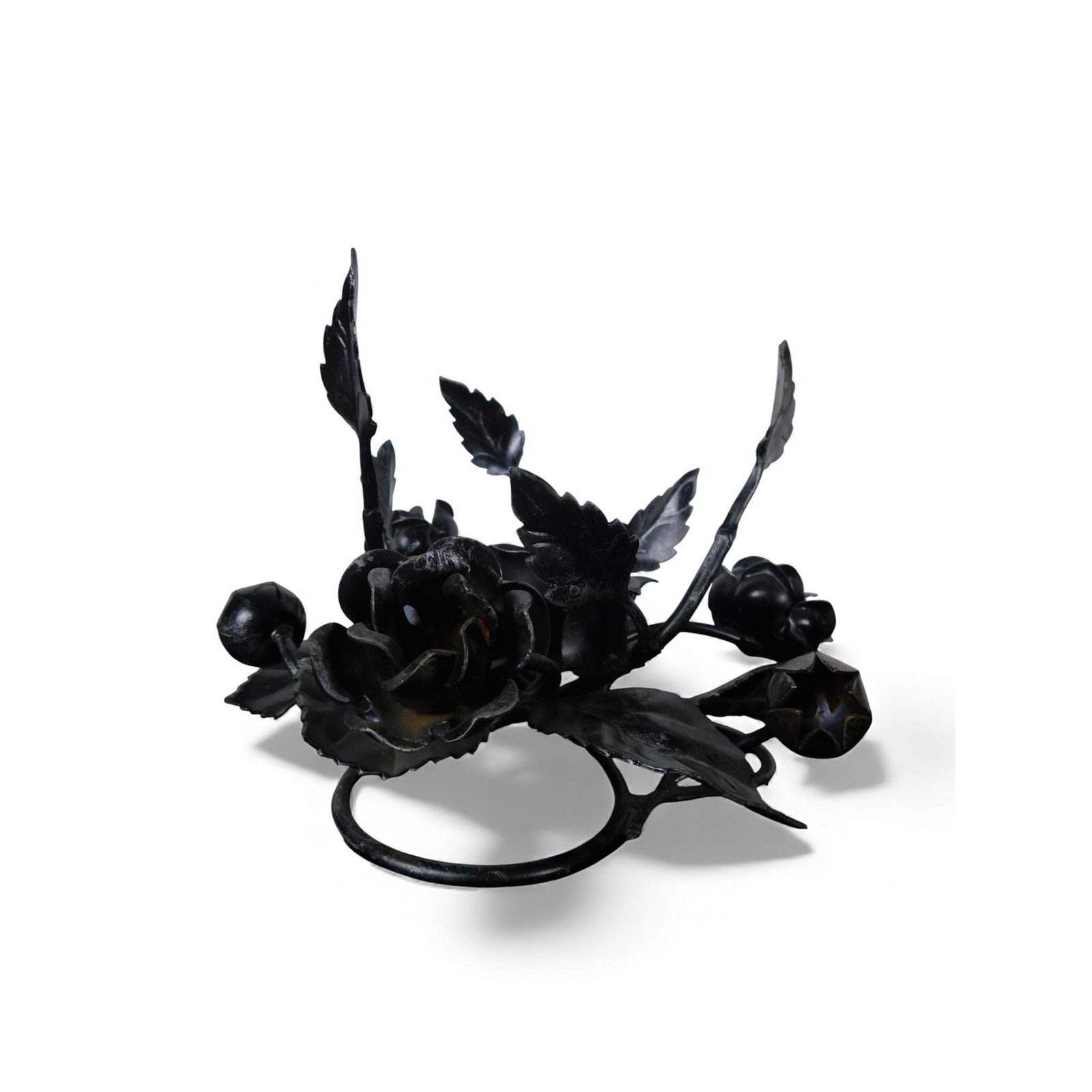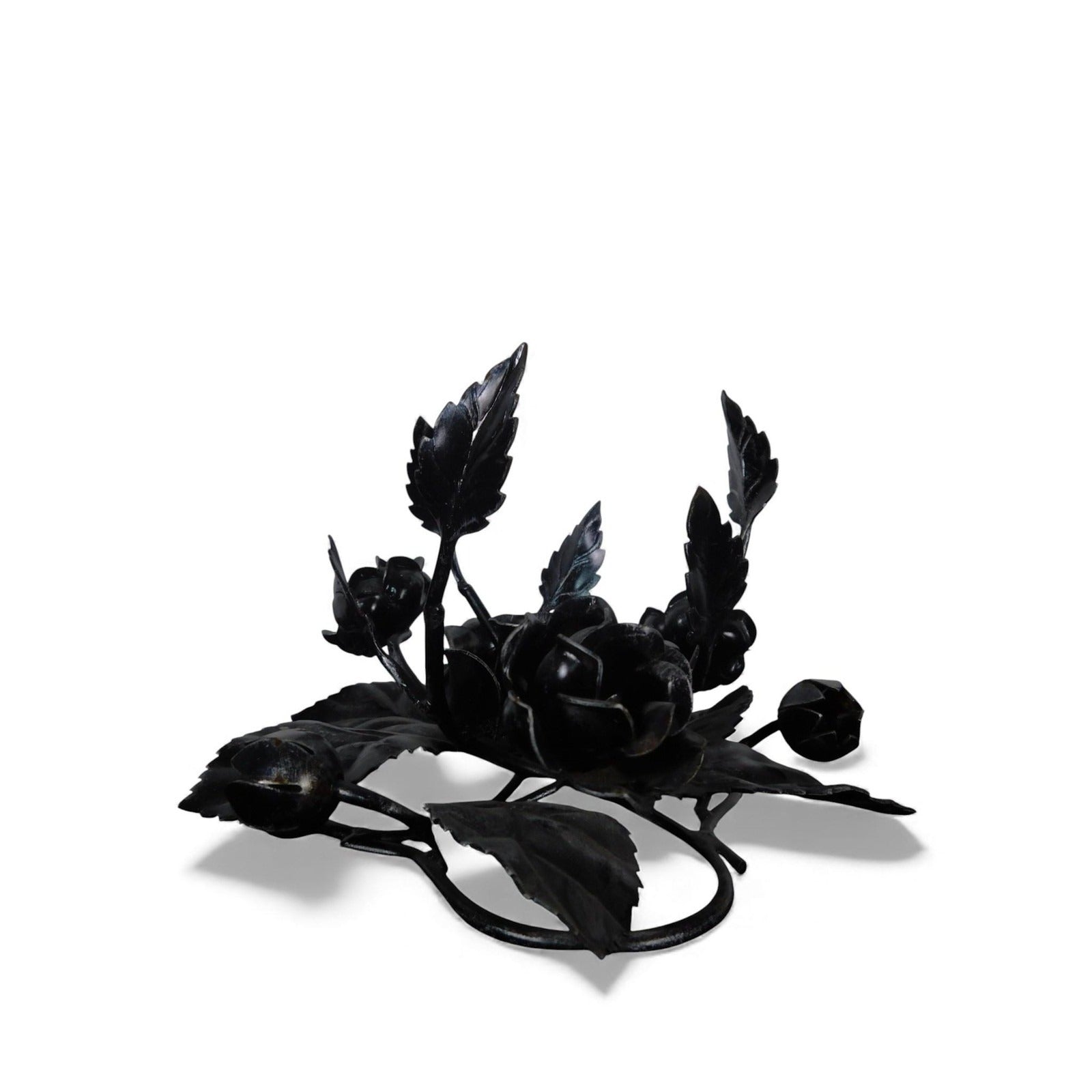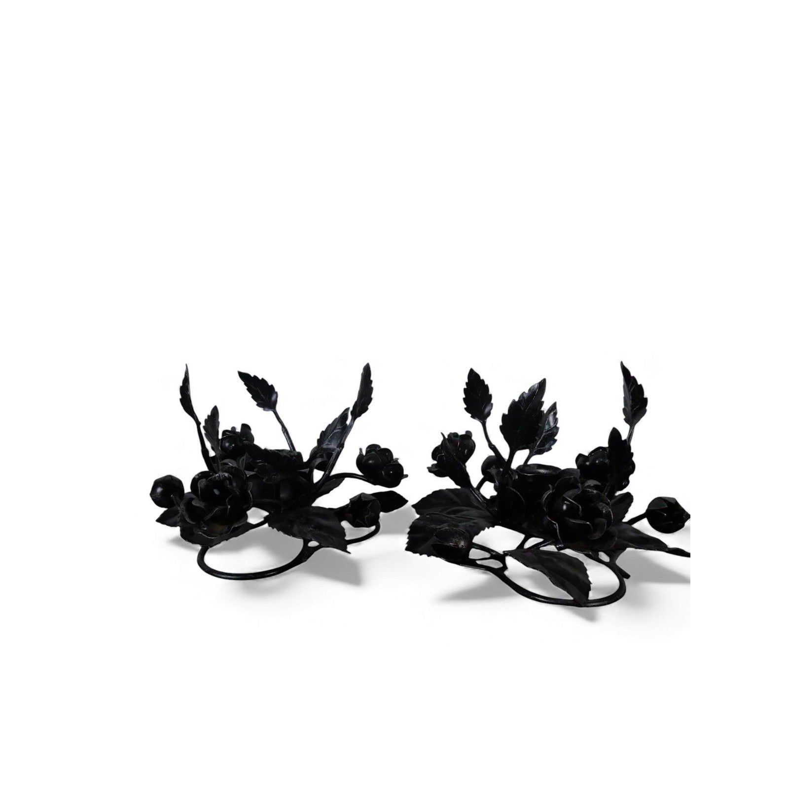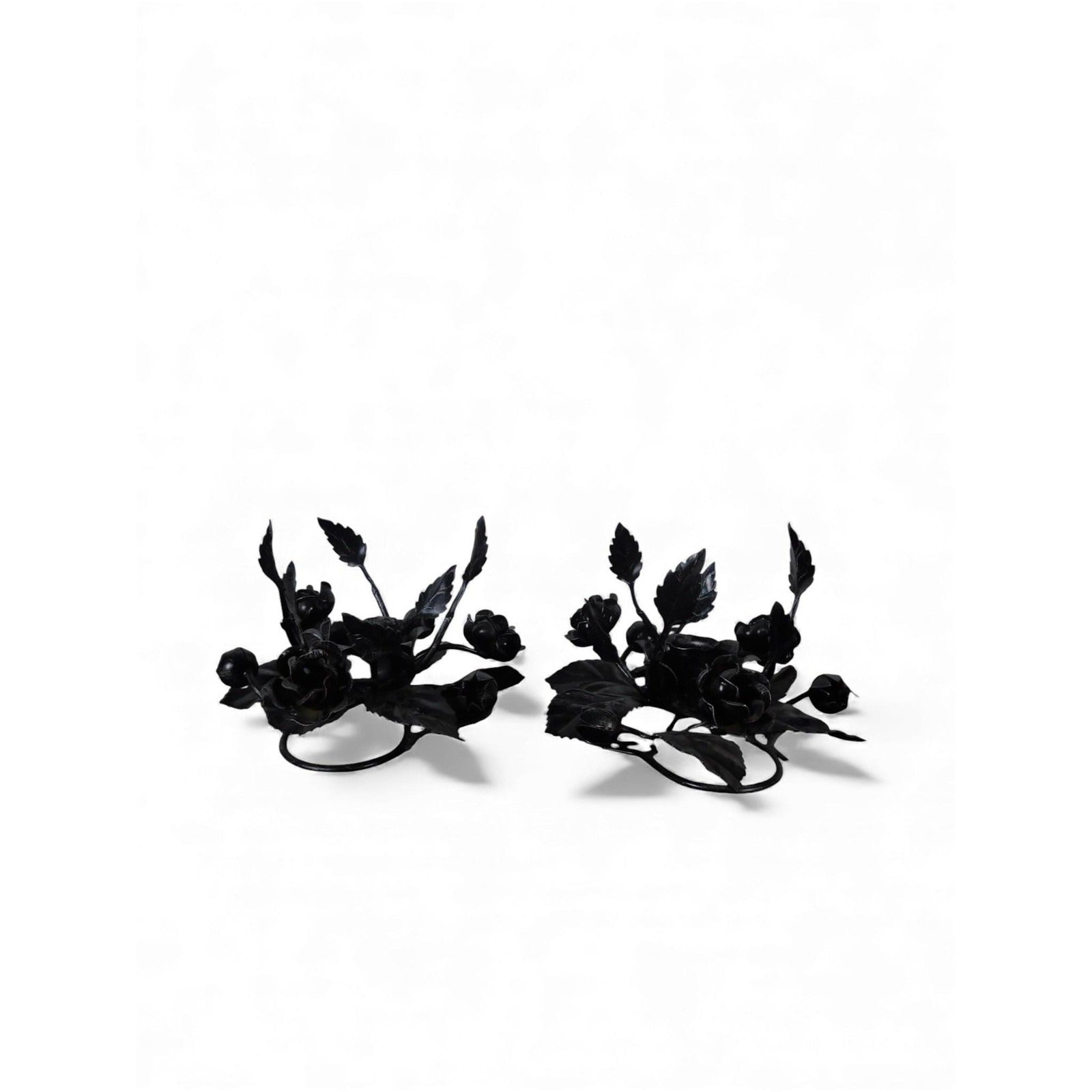 Item: Pair of decorative black metal candle holders or centerpieces with sculpted roses, buds, and leaves arranged around circular bases.