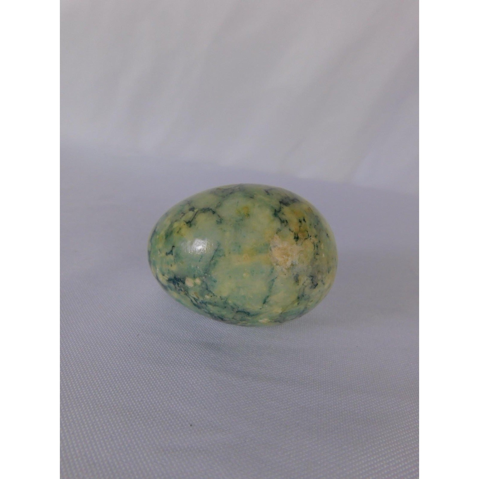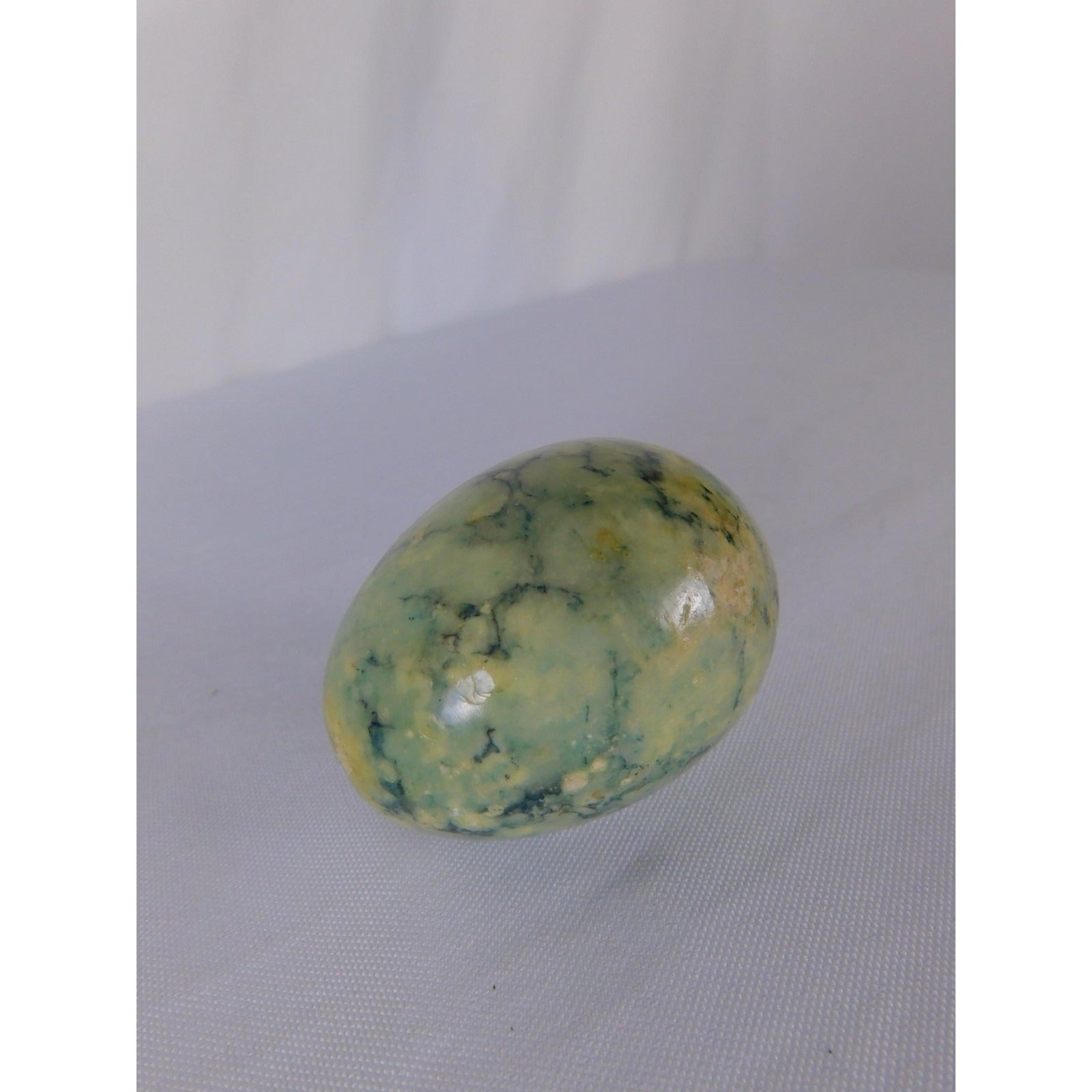 Small polished stone egg featuring marbled green, yellow, and cream tones with darker veining. A charming accent for witchcraft altars, crystal grids, meditation spaces, pocket talismans, and earthy home decor.