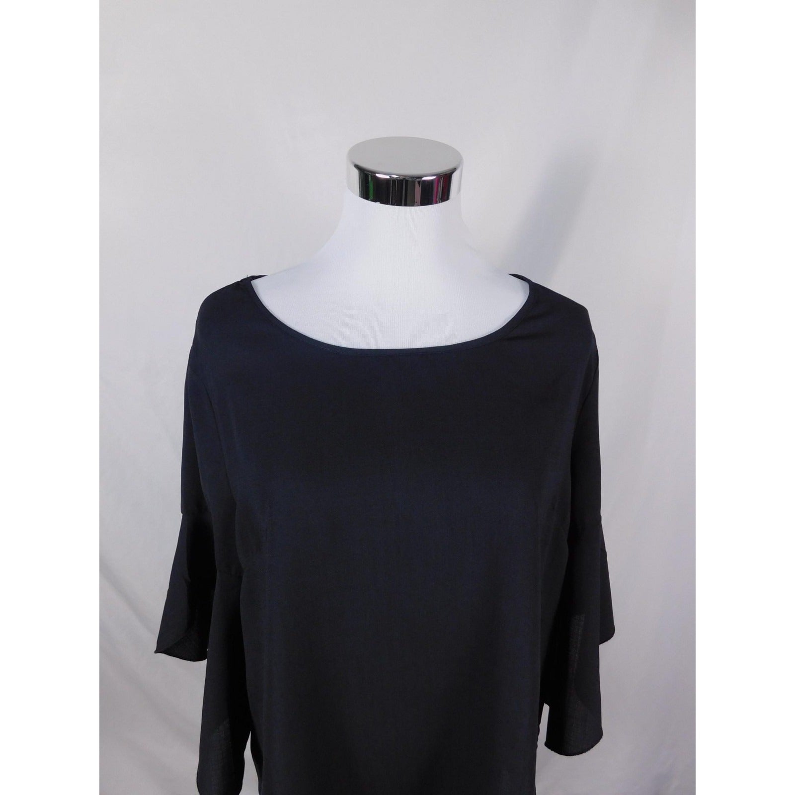 Drift through starlit spells in this pre-owned SHEIN XL (US 12) black bell-sleeve blouse (27" long, 22" pit-to-pit)—100% polyester flows with dramatic ruffled bell cuffs, scoop neck, drop-shoulder ease, curved shirttail hem. Lightweight, pull-on magic for Ethereal & Elemental coven layers or moonlit markets. Machine wash. The Witches Quest curation.