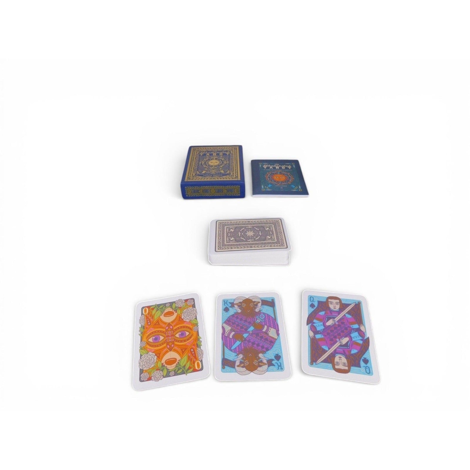 Color: Royal blue and metallic gold storage box with multicolor illustrated cards and matching blue guidebook