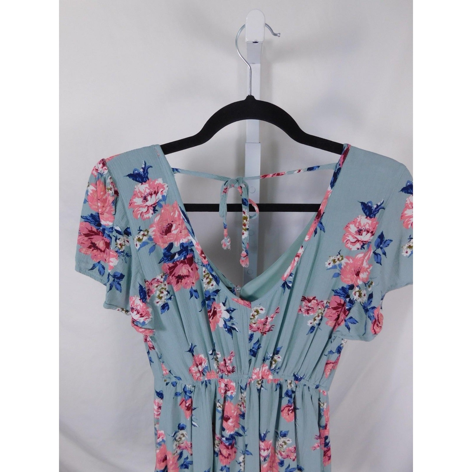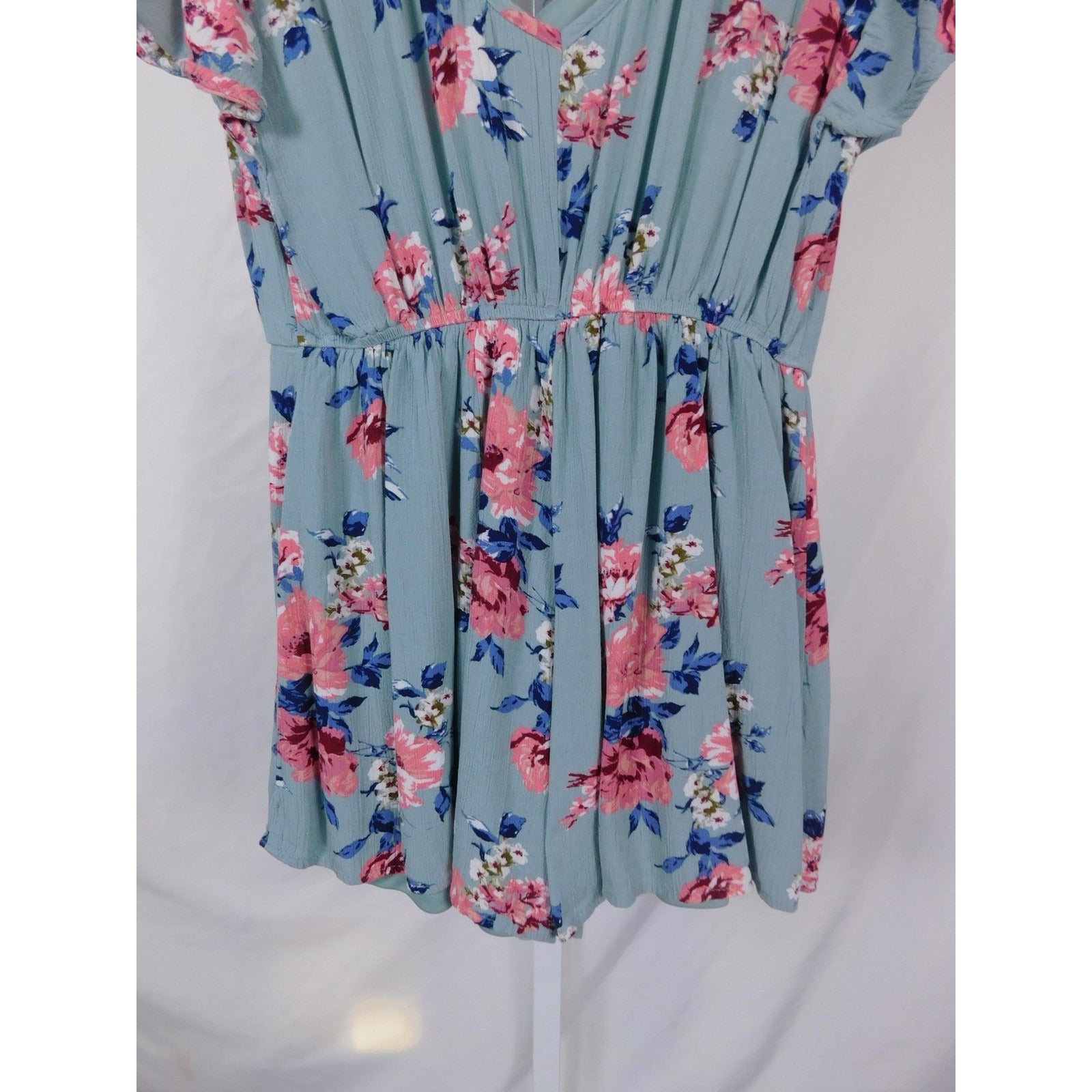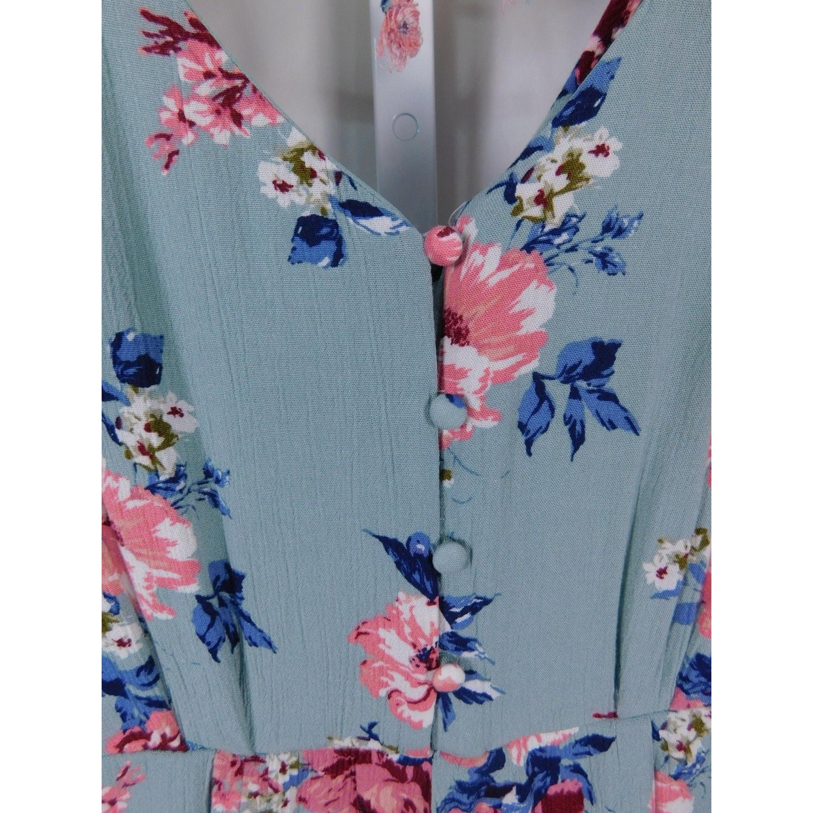 Dance through moonlit meadows in this pre-owned Three Pink Hearts women’s S sage floral romper (32" long, 17" bust, 13–15" elastic waist)—100% rayon shell floats with pink & blue blossoms, lined in polyester, V-neck front & back, flutter sleeves, fabric buttons, tie-back strap. Lightweight flow for Earth & Nature witch rituals or summer solstice. Made in China 26S2361311. The Witches Quest curation.