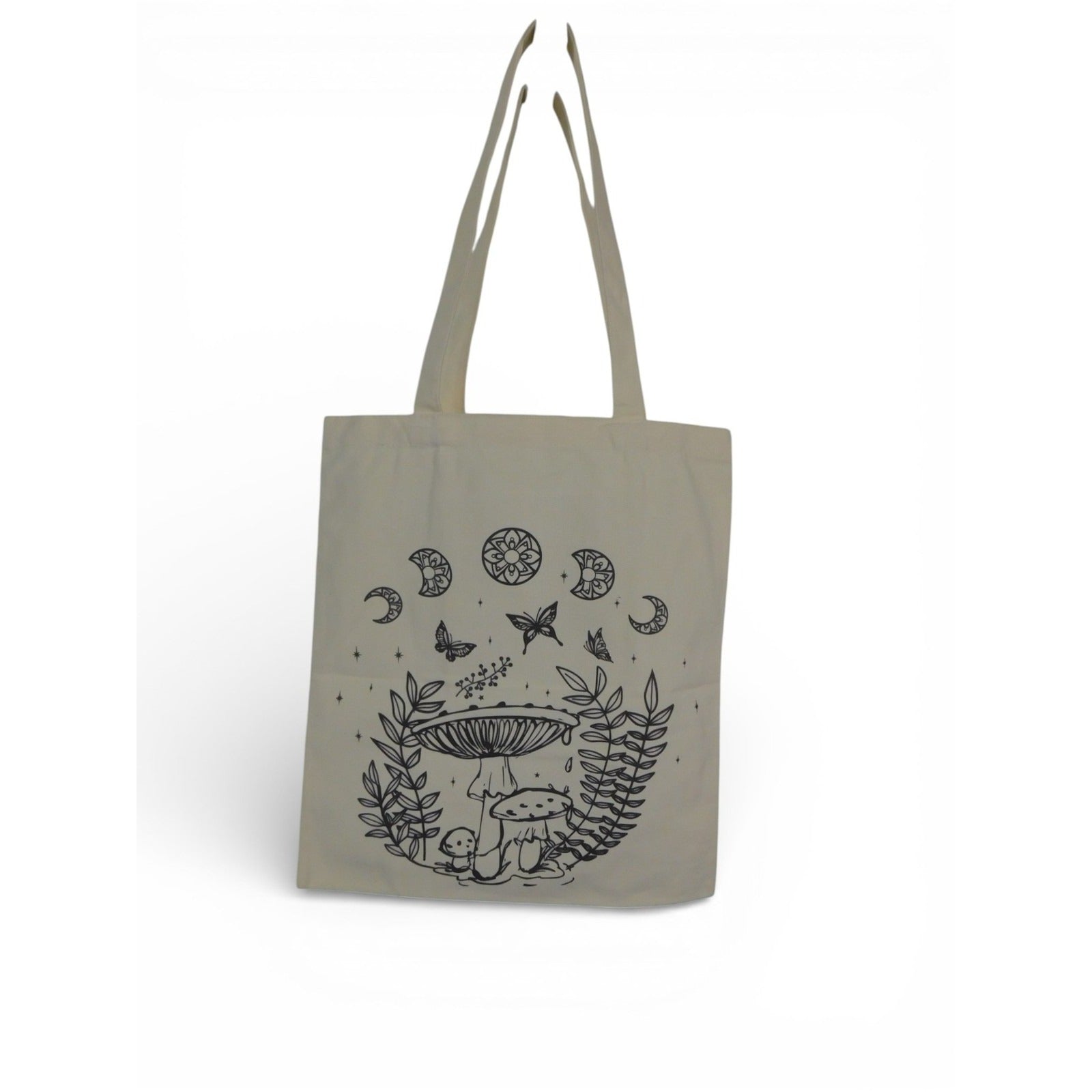 Design/features: Rectangular open-top tote with two long shoulder straps, featuring black line-art style illustrations. One side shows a crescent moon, stars, butterflies, mushrooms, foliage, and a small fairy-like character on a mushroom. The other side features large mushrooms, butterflies, leafy branches, and decorative moon and sun motifs surrounded by stars.