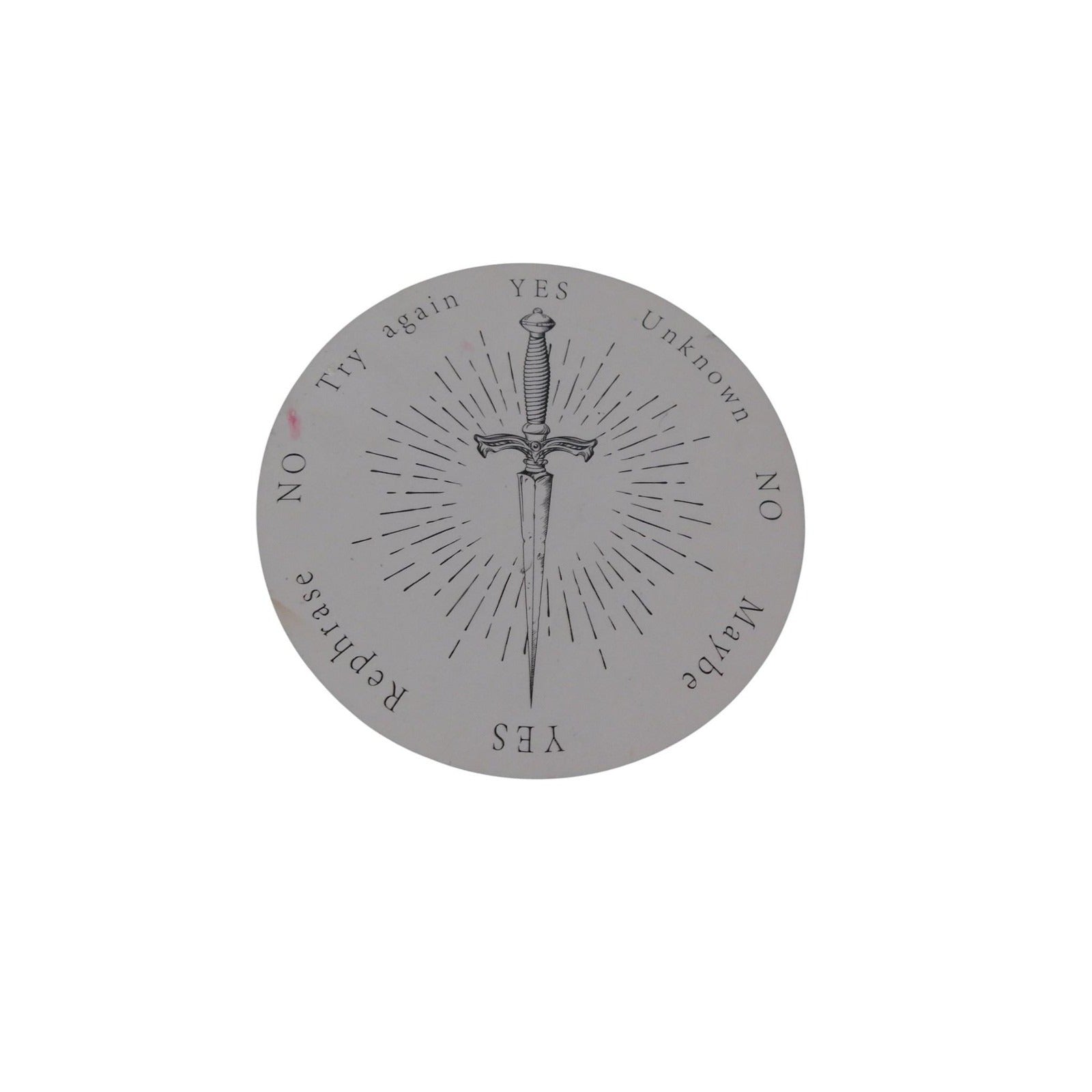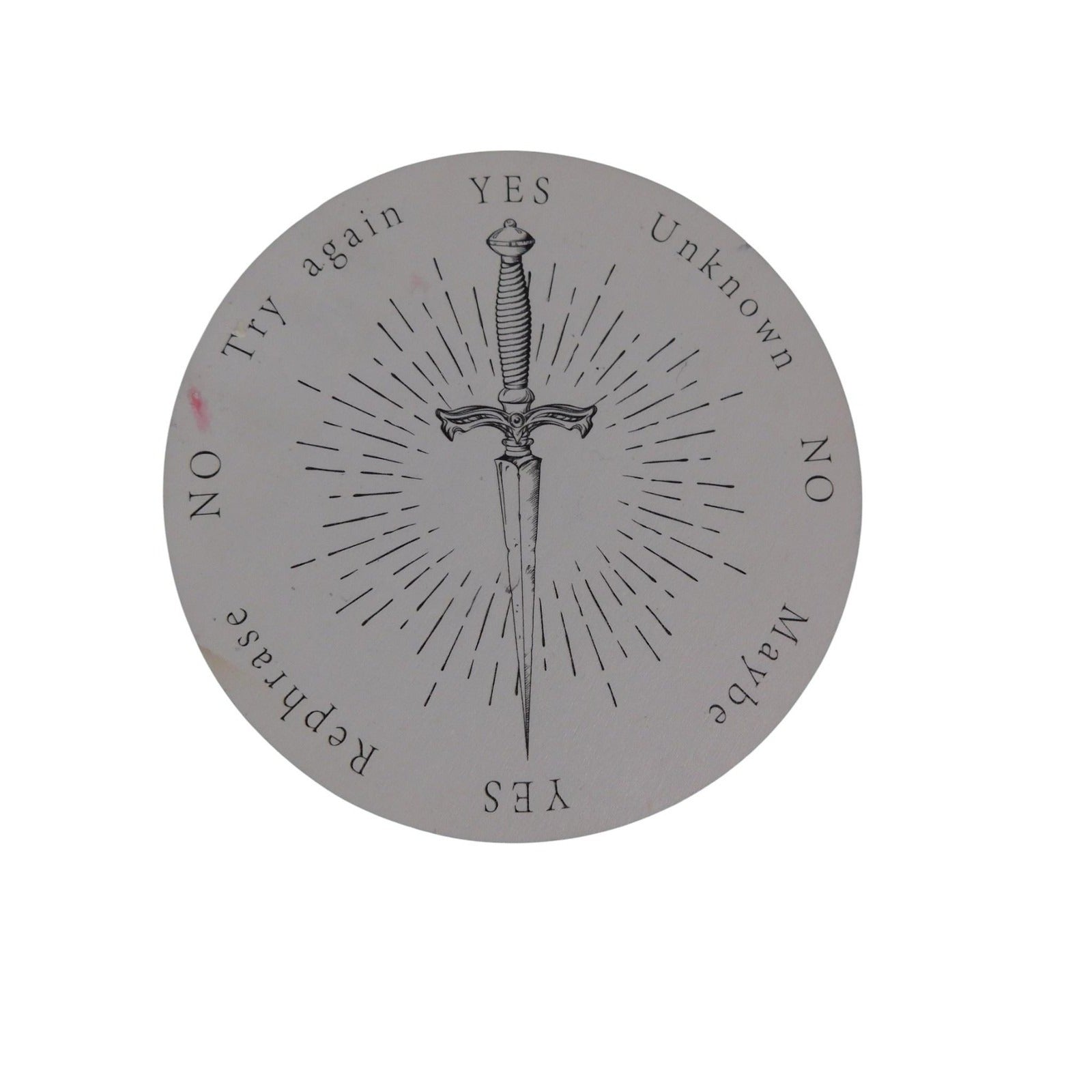 Details: Large round pendulum board with engraved triple moon and pentacle design, smaller round oracle disc printed with sword graphic and responses YES, NO, Maybe, Unknown, Try again, Rephrase, matching pendulum with faceted point and leaf charm, ideal for scrying, altar decor, witchcraft, or metaphysical divination practices