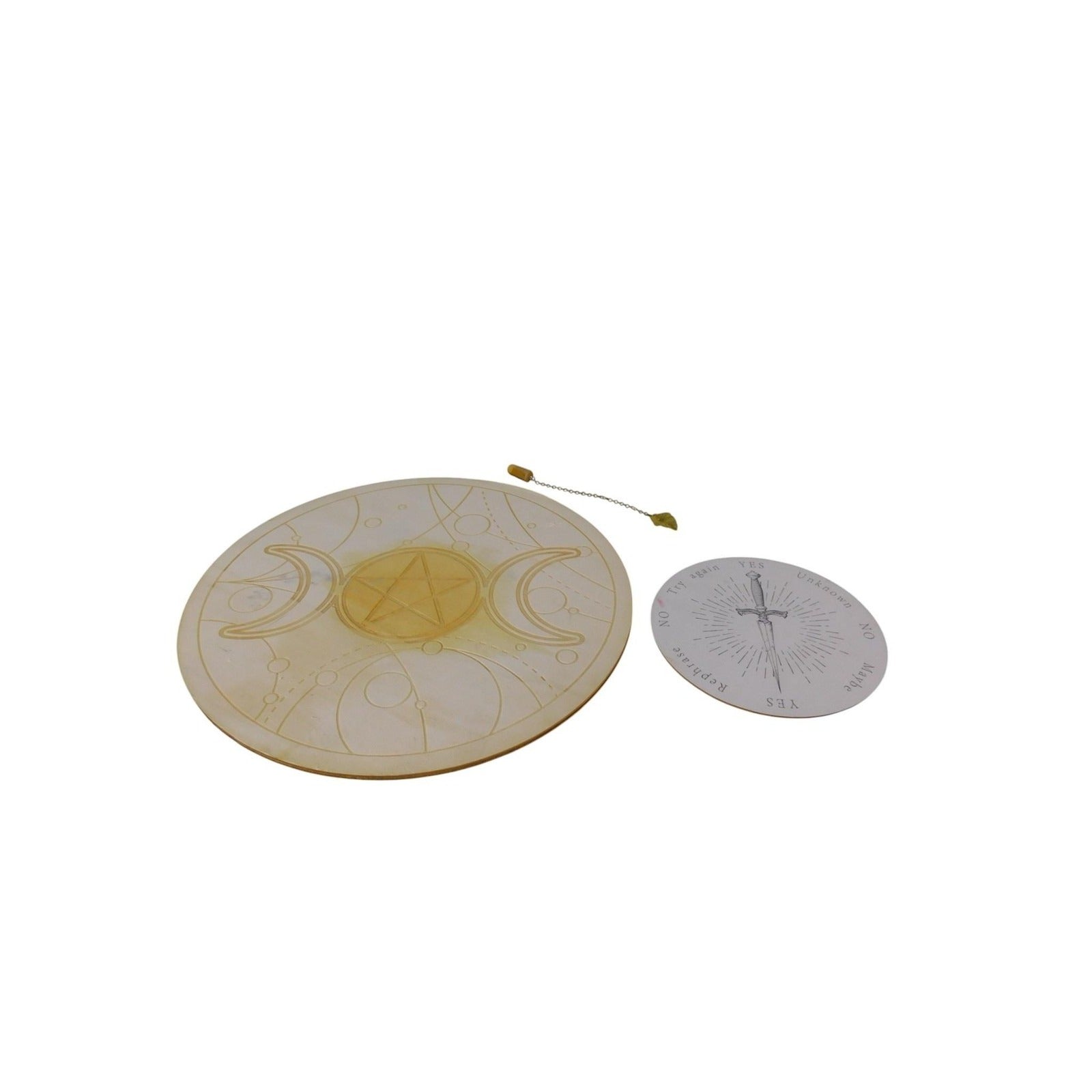 Keywords: pendulum board, triple moon pentacle, witchcraft altar, divination set, yes no oracle, pagan wicca decor