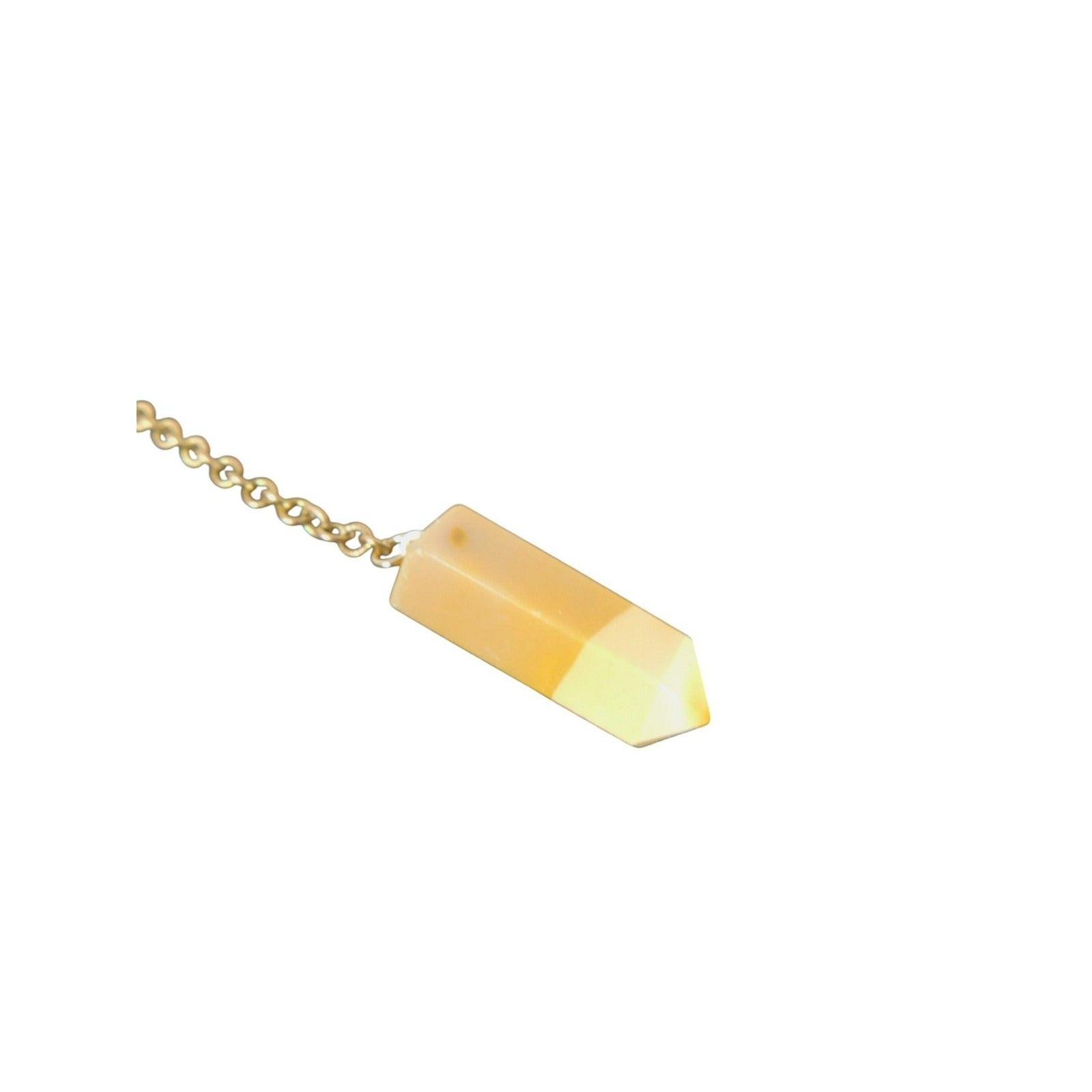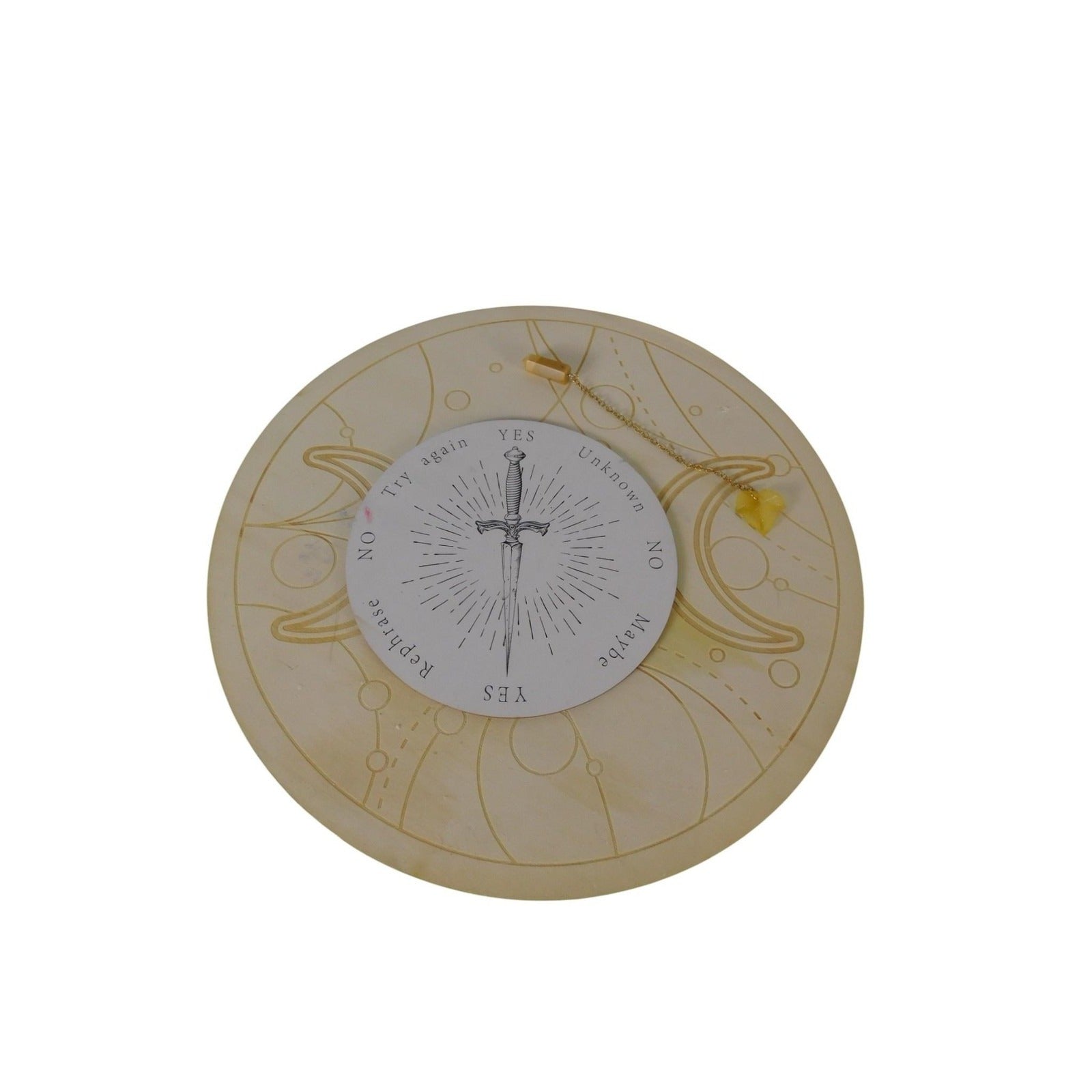 Color: Natural wood tone board with white and black printed oracle disc and yellow crystal pendulum