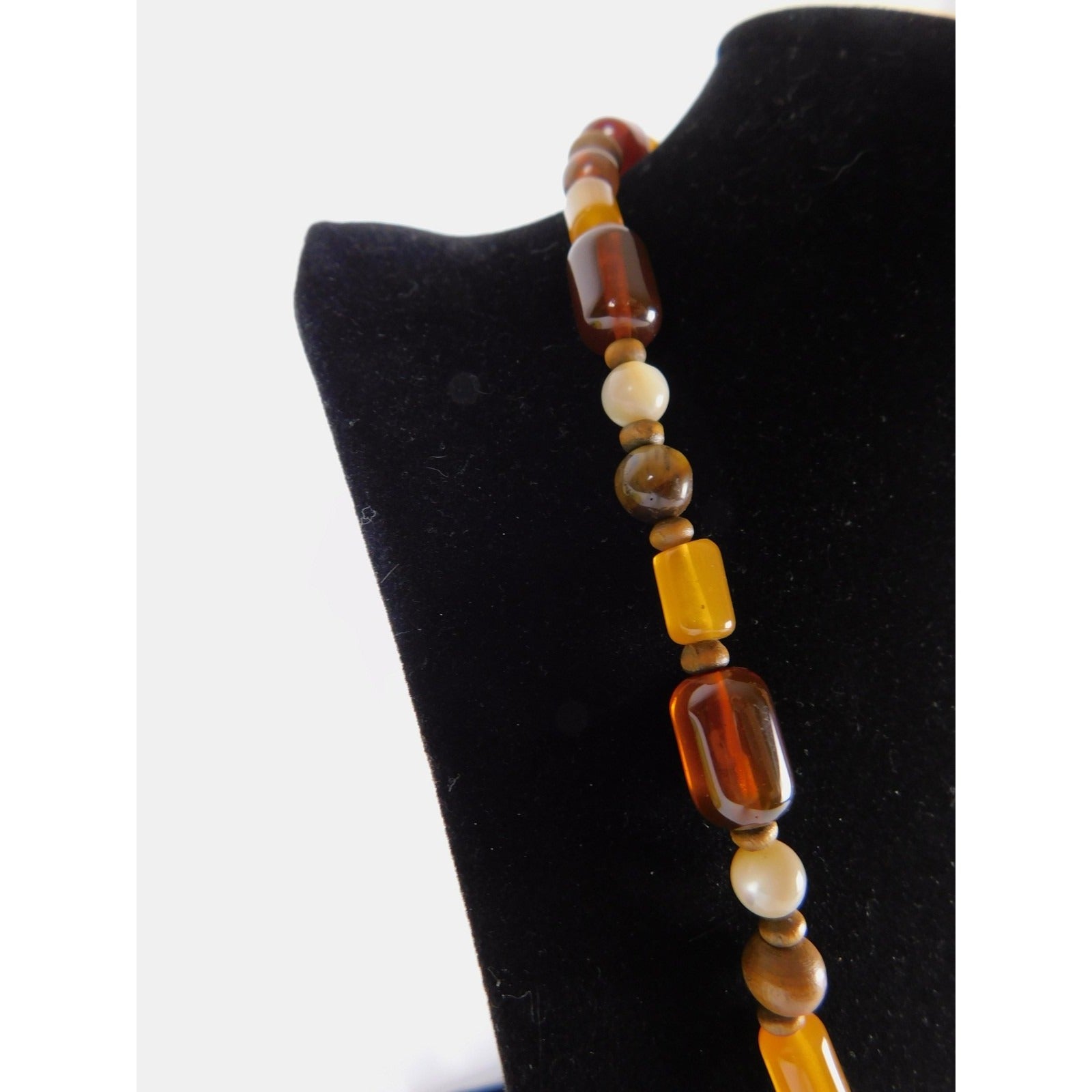 Vintage beaded pendant necklace featuring a variety of brown, amber, mustard yellow, and cream beads.