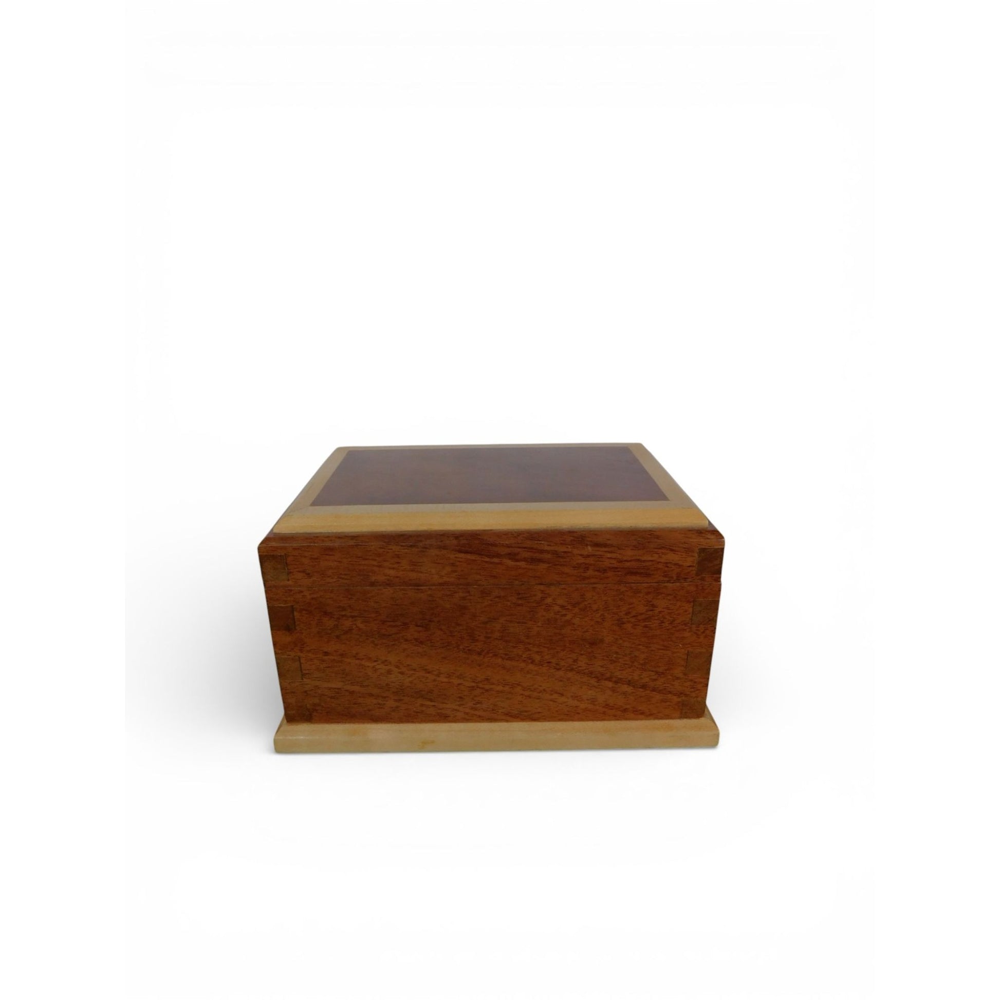 The box is made from contrasting light and medium-tone woods, showcasing visible grain and clean joinery consistent with mid-century handmade woodcraft. Simple, functional design with a warm, understated presence—well suited to rustic, minimalist, or lodge-style interiors.