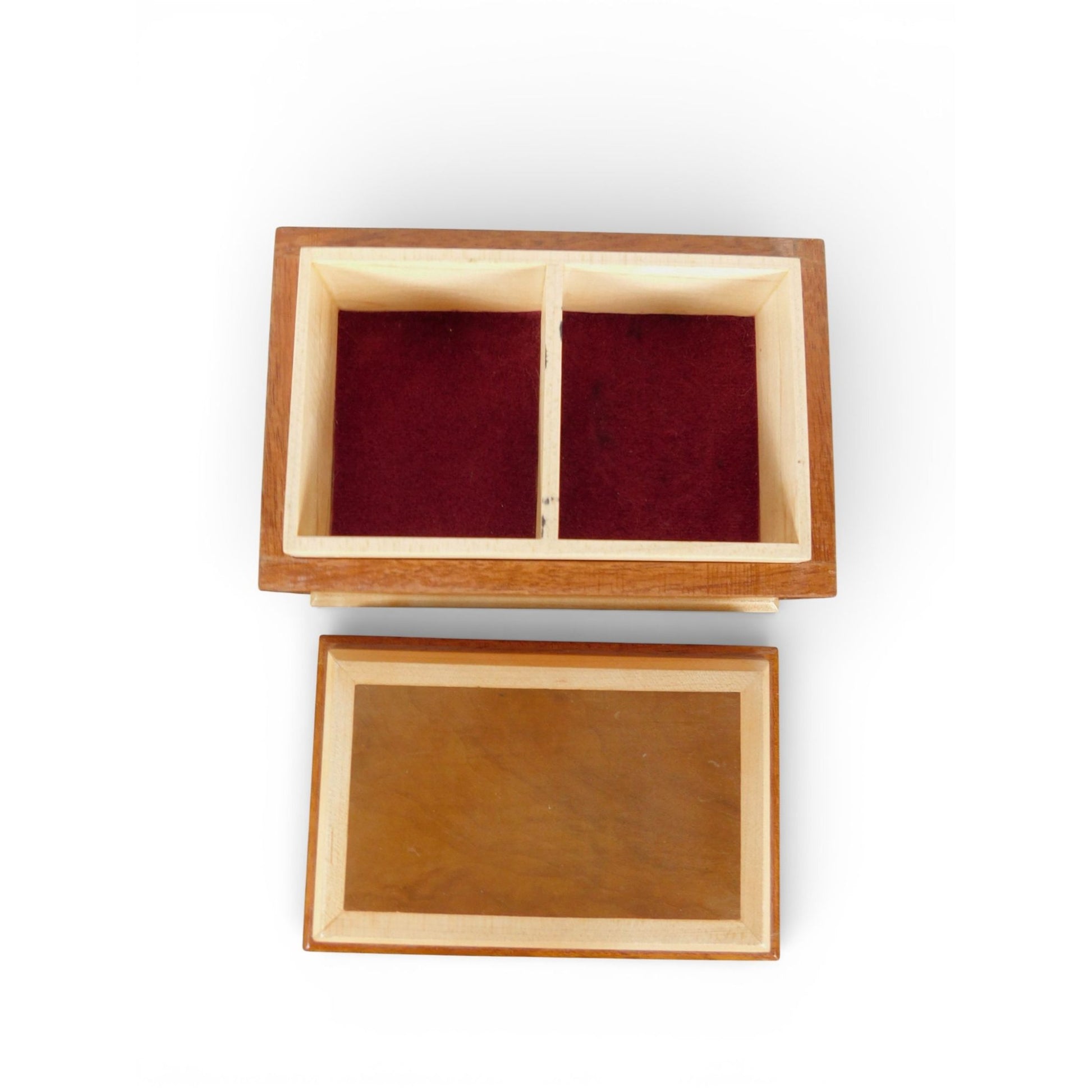 Vintage handcrafted wooden jewelry / keepsake box, featuring solid wood construction with a fitted lift-off lid and a removable divided tray. The interior is lined in deep red felt, with two upper compartments and additional storage below, offering practical organization for jewelry, keepsakes, or small collectibles.