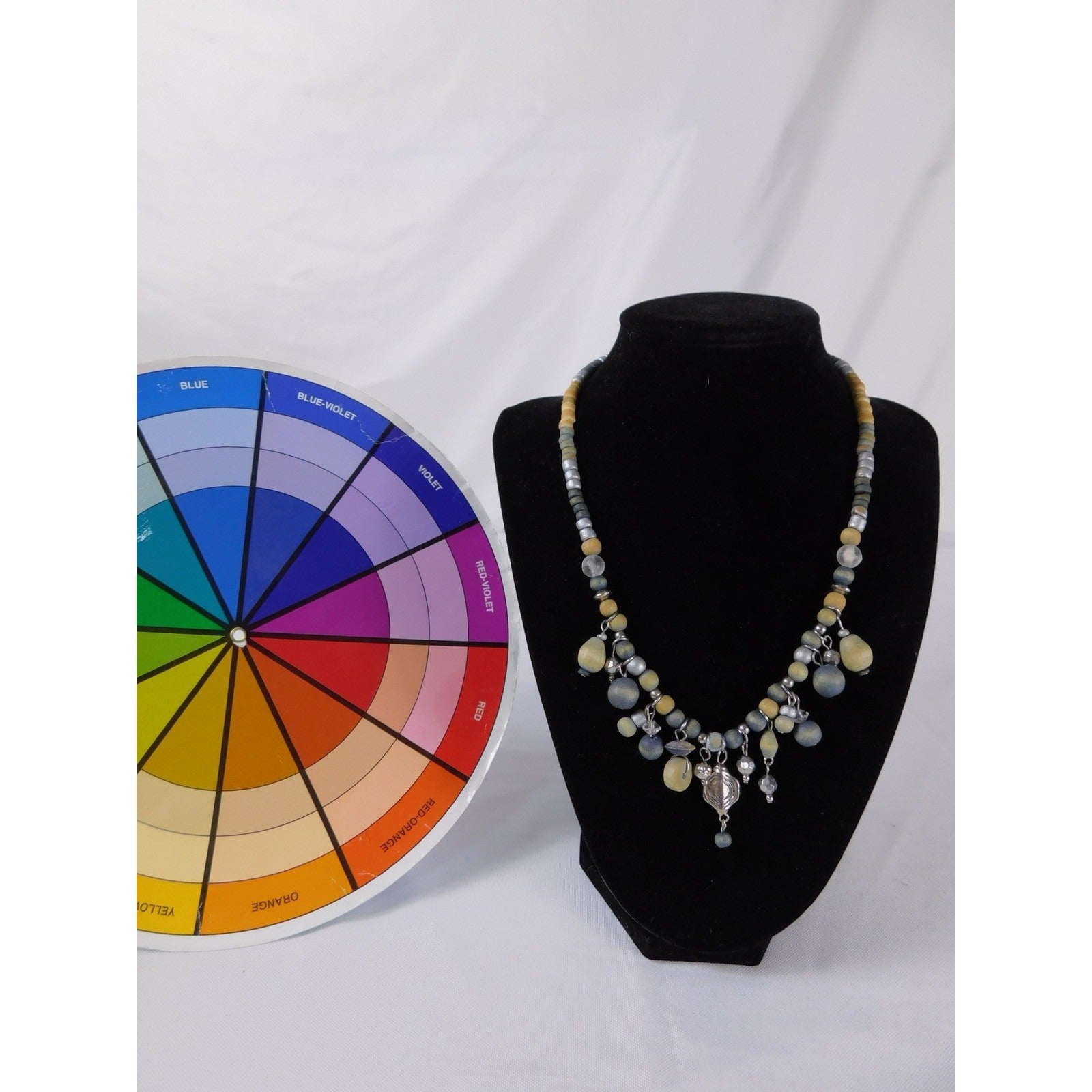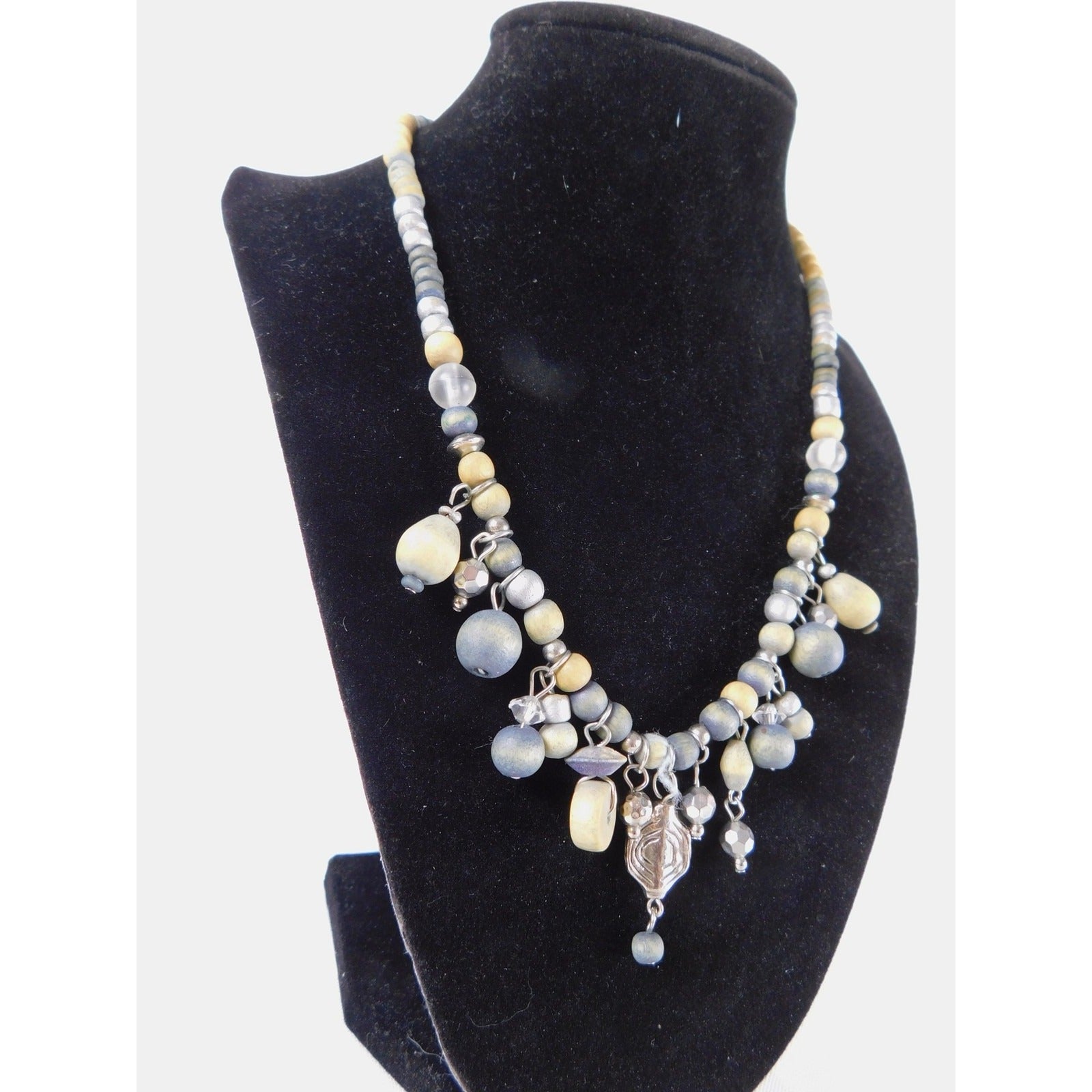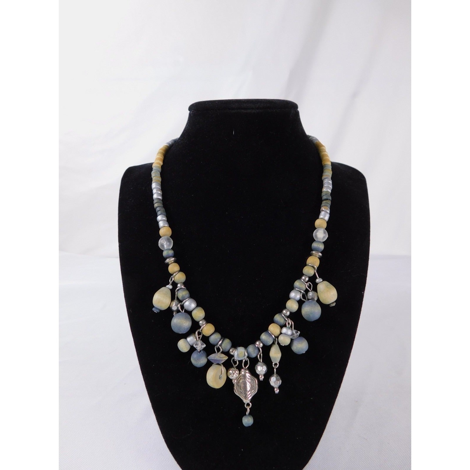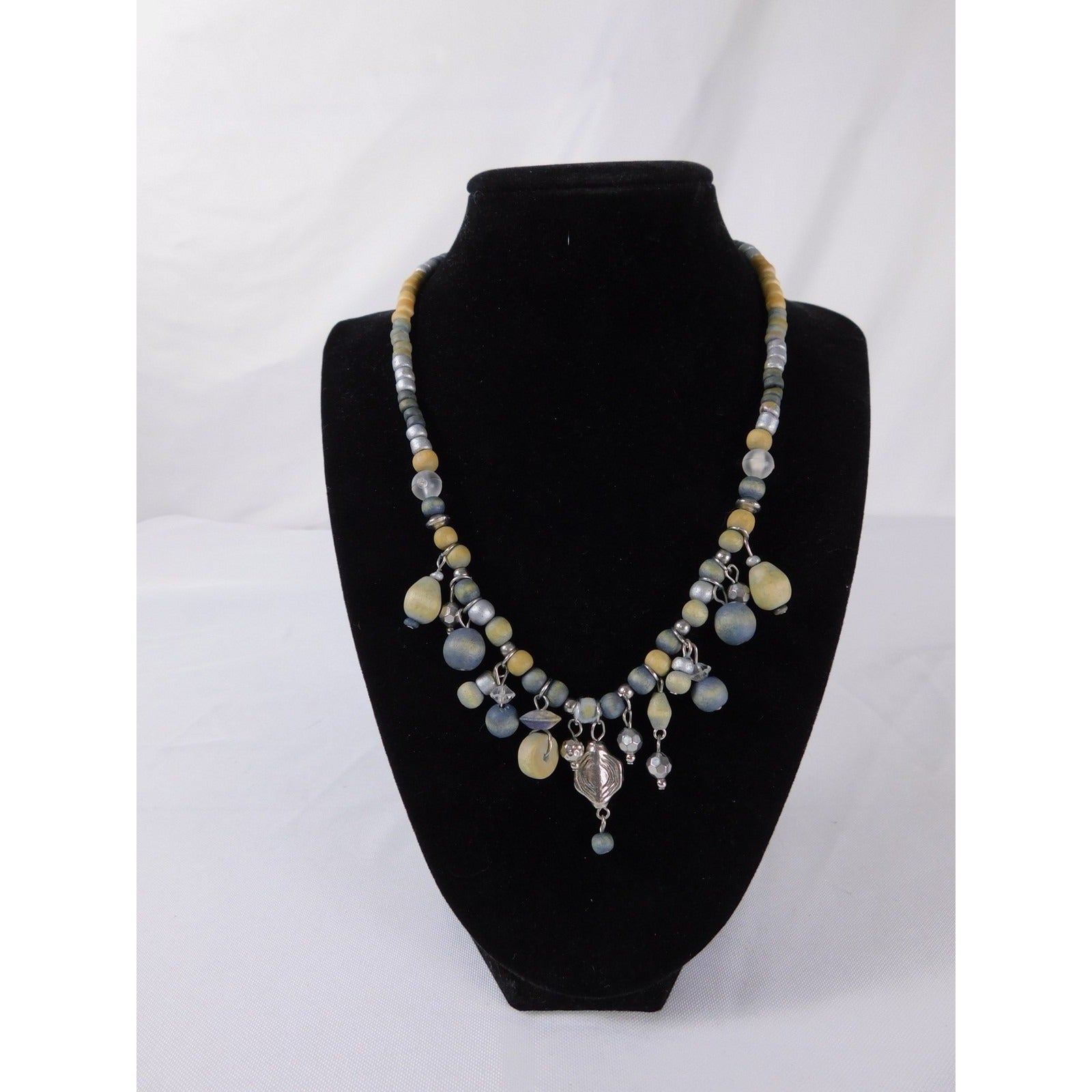 Vintage Handmade Beaded Necklace Mixed Blue Yellow Silver Tones Dangles Boho Unique