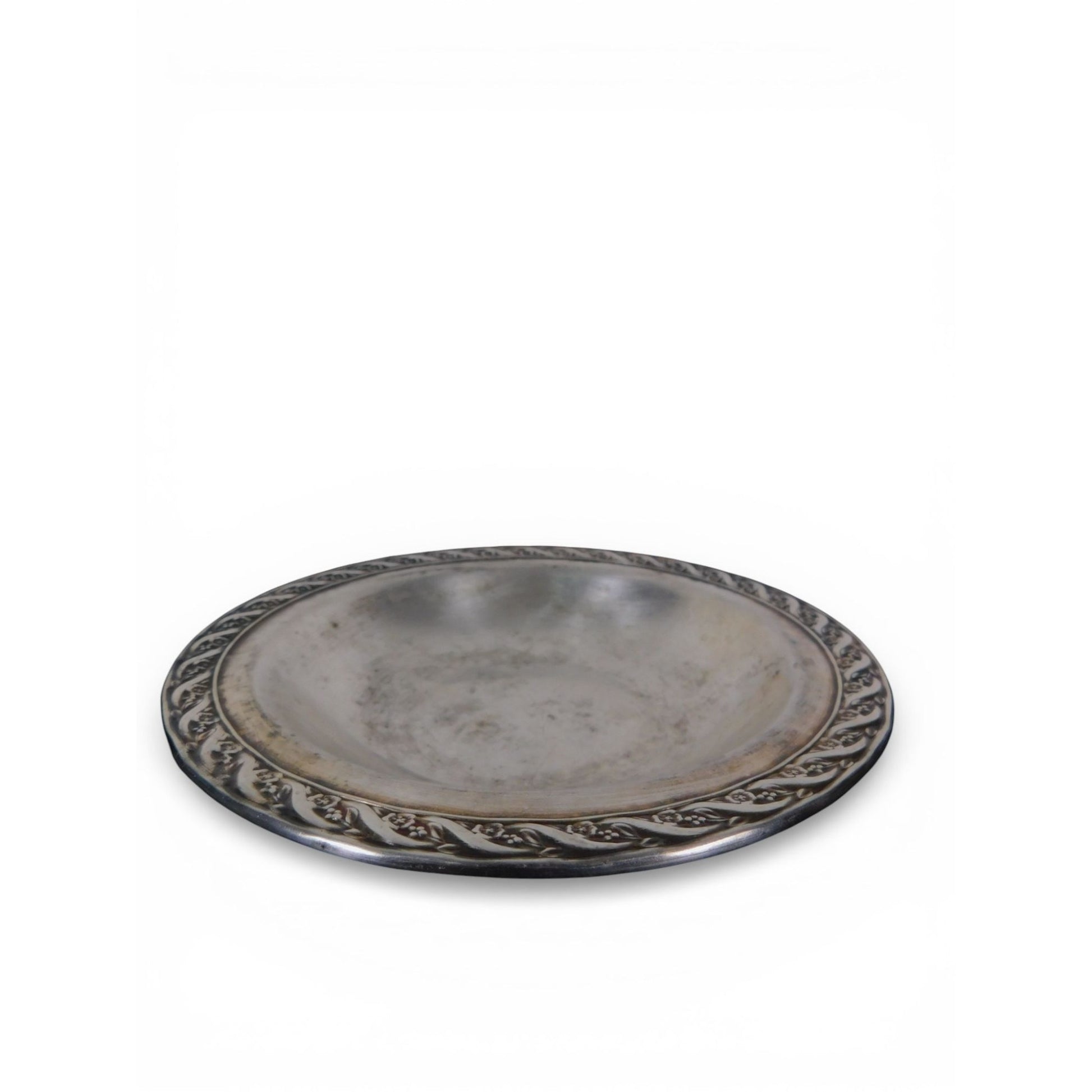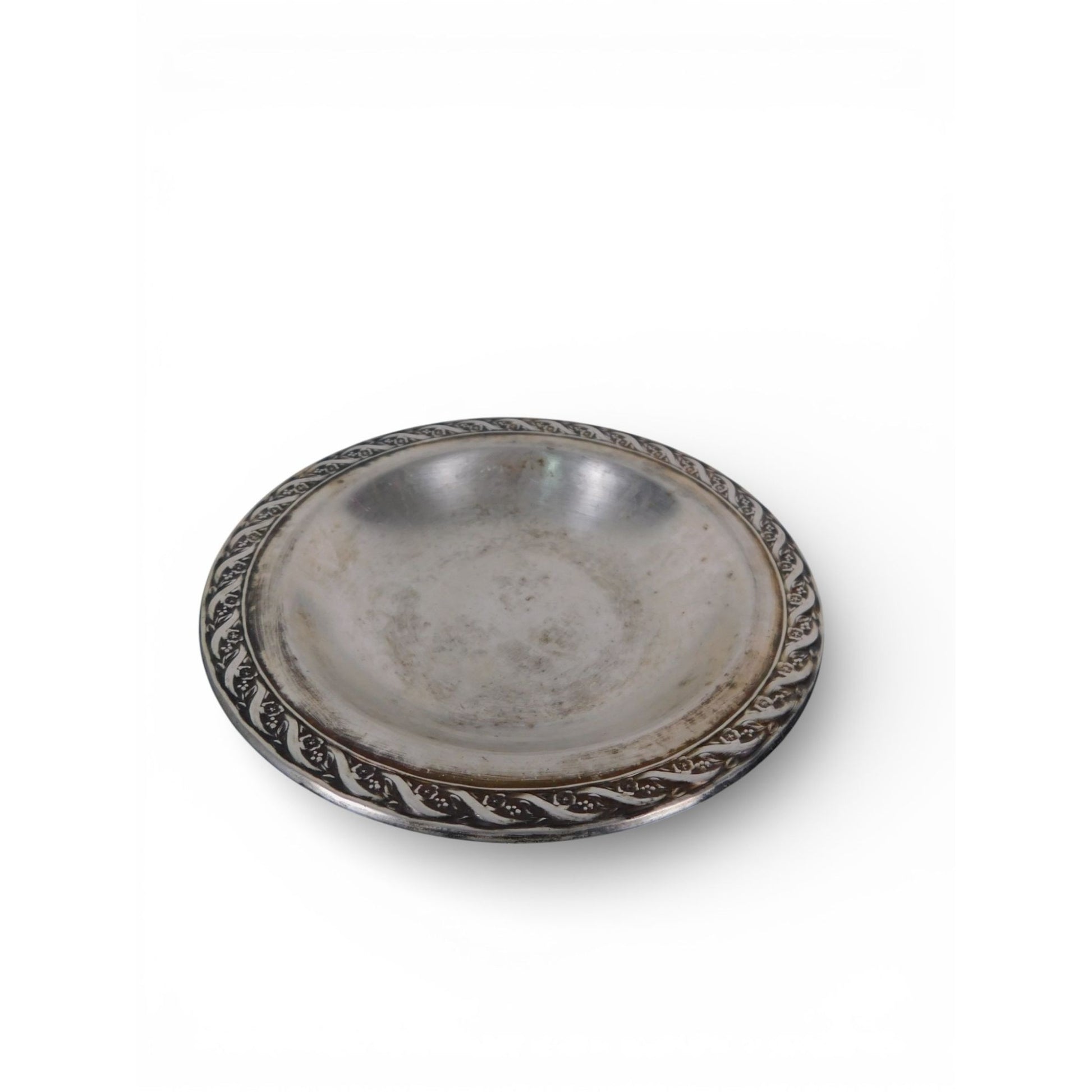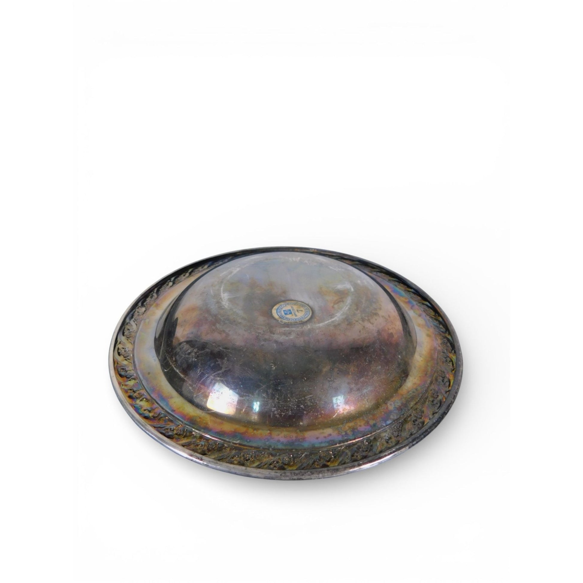 Classic vintage silverplate round serving bowl featuring a decorative floral rope-edge rim with softly sculpted detailing. The gently curved interior makes it ideal for nuts, candies, side dishes, or tabletop display. A timeless piece with traditional elegance and natural age character.
